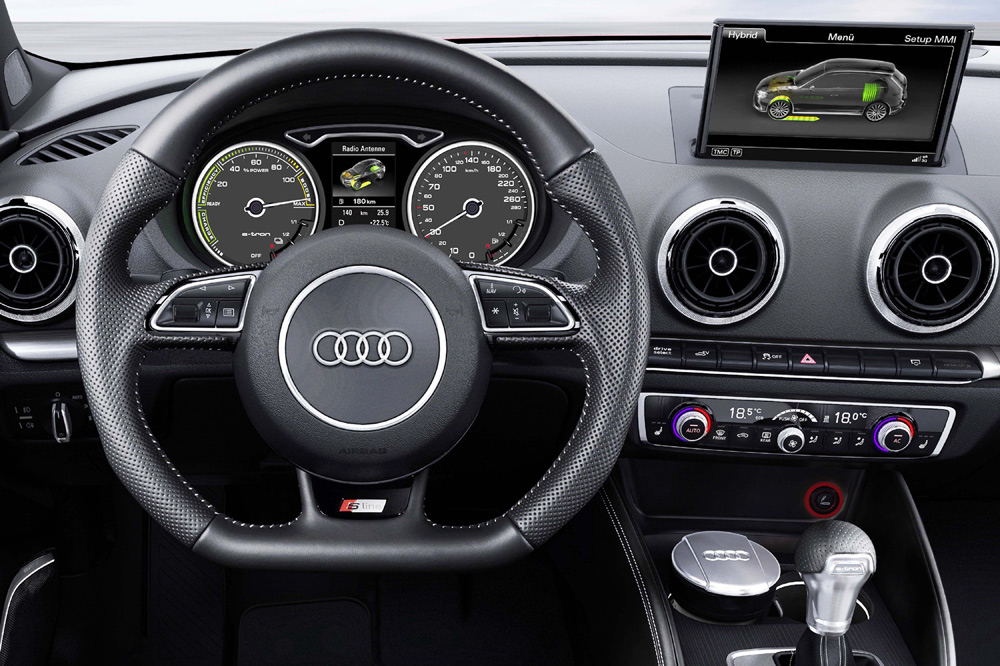 Los diseñadores apenas han llevado un par de retoques en la carrocería, y tampoco en el interior nos llevaremos sorpresas. Aparte de la pantalla dividida que ofrece información del motor eléctrico y el de combustión, en general es idéntico a un A3 normal (prueba Audi A3 2012 1.8 TFSI S tronic). Y como la batería de ión-litio va situada detrás de la banqueta trasera, sigue teniendo espacio de sobra para cinco personas. El maletero sí que se ve algo mermado, pero mantiene capacidad suficiente para equipaje (disminuye de 380 litros a 280).