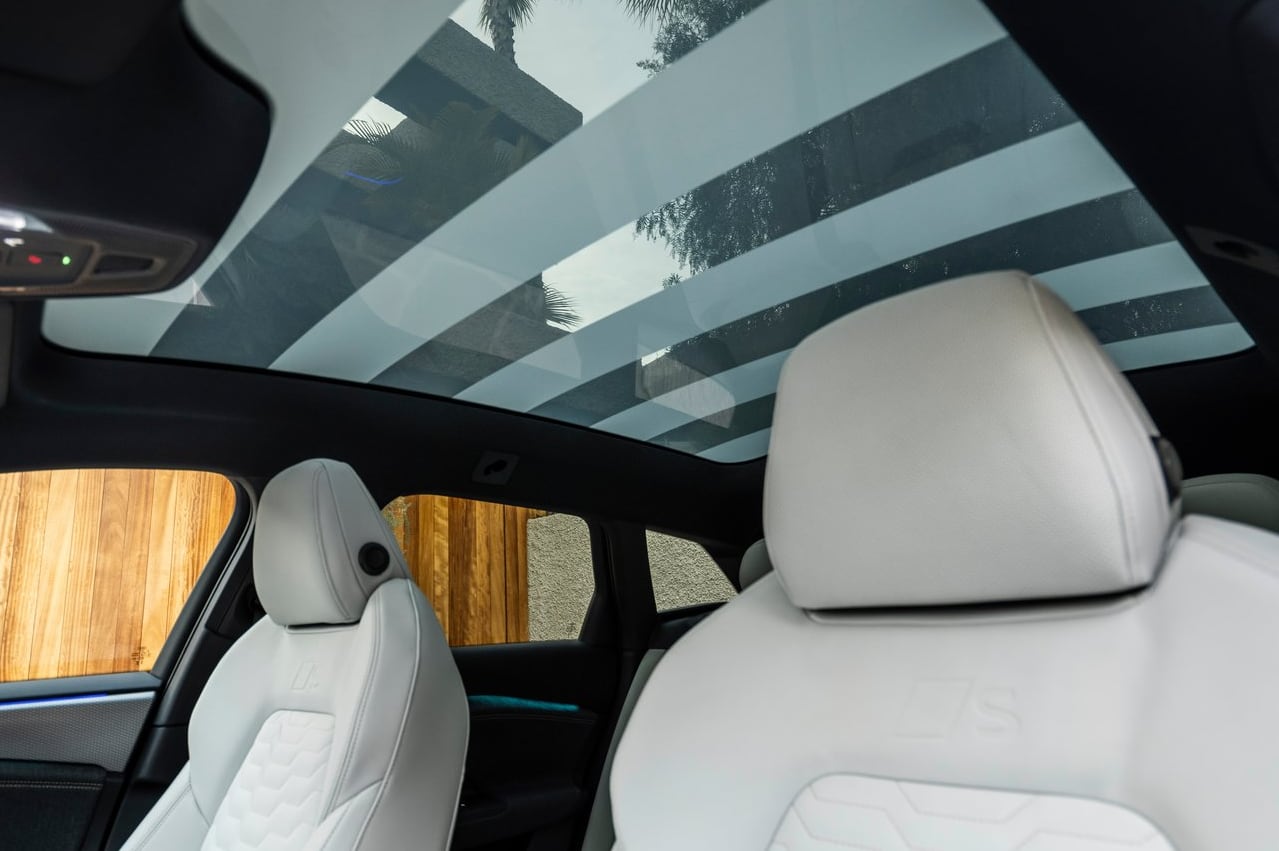 Las plazas traseras guardan buen espacio tanto para la cabeza como las rodillas de los pasajeros (tiene una batalla de 2.946 mm) que, como yo, midan 1,78 m. Y eso a pesar de equipar techo panorámico, que da más luminosidad y, por tanto, sensación de espacio, y que en el caso del A6 e-tron, es de cristal líquido disperso de polímeros, que se puede poner biselado o traslúcido a golpe de botón en un segundo. Lo que sí me llama la atención es que el piso no sea totalmente plano al ser un coche eléctrico y carecer de transmisión. Según me ha informado Audi, es por la forma de la carcasa de la batería.