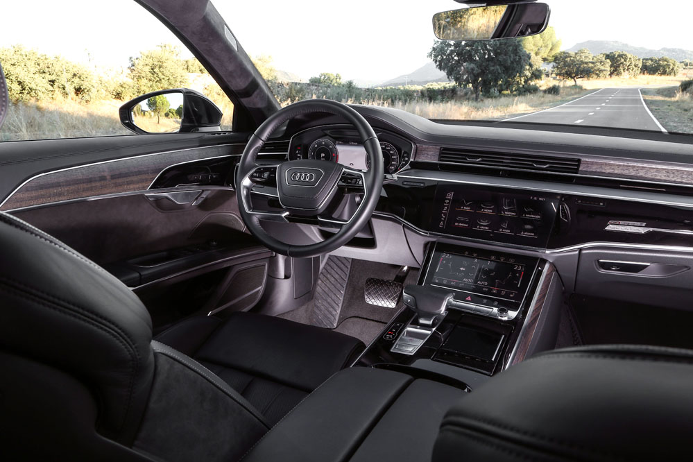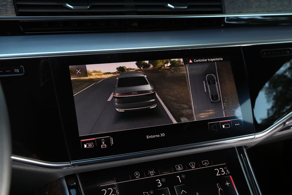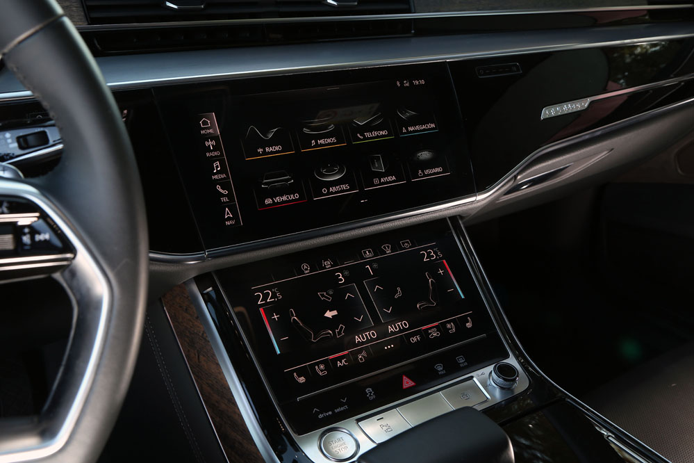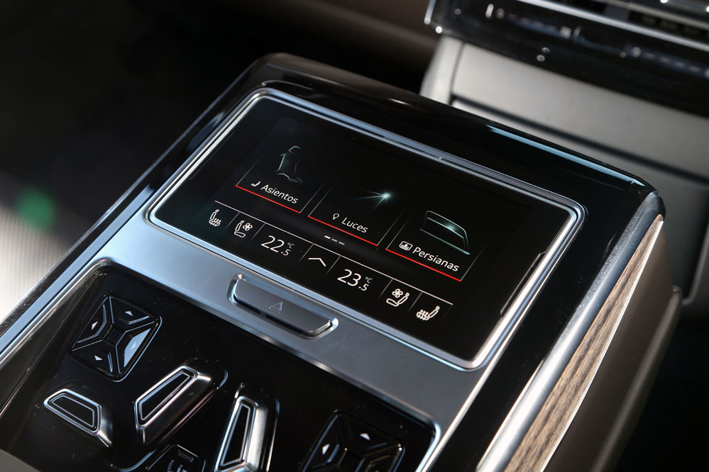 La sensación de calidad es abrumadora. Los múltiples recursos que utiliza, como las pantallas o los botones táctiles, incluidos los de las salidas de ventilación, crean una atmósfera donde se citan el lujo y la tecnología. Como si fuese una nave espacial, que por tamaño podría serlo, equipa tres pantallas de generosas dimensiones -sin olvidar el Head-up display (1.700 euros)-, eso en la parte delantera. La primera es el ya conocido Audi Virtual Cockpit, de 12,3", con nuevos gráficos y una resolución full HD de 1920x720 pixeles. Las otras dos, con click virtual conseguido con un electroimán, son la novedad: la primera tiene 10,1" y está integrada en el 'black panel', una nueva superficie en negro brillante, perfecta para marcar las huellas dactilares, que se extiende horizontalmente por la zona media del salpicadero. La segunda es de 8,6" y está alojada en la consola del túnel central. Gracias a ella, Audi ha prescindido de muchos botones, dando un aspecto más limpio al conjunto. No soy partidario de este tipo de soluciones, pero tengo que reconocer que la firma alemana lo ha resuelto bastante bien. Porque acceder a los ajustes del climatizador y a otra serie de funciones se realiza de forma rápida y en escasos pasos. Asimismo, alabo la función de escritura que ofrece esta última pantalla, facilitando las cosas a la hora de introducir una dirección en el navegador. ¡Chapó¡