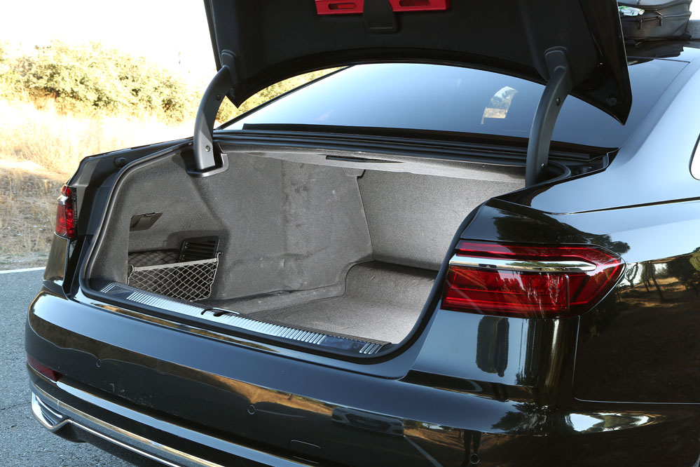 'Por desgracia' no puedo continuar la prueba del Audi A8 50 TDI quattro tiptronic tendido, así que, armándome de fuerza, salgo del habitáculo, comprobando primero el cierre eléctrico que tienen las puertas, algo común en este segmento. Me dirijo al maletero, cuya tapa se abre y se cierra mediante un botón. Descubro que tiene una capacidad de 505 litros, pero también, que no tiene formas regulares y que, además, su piso no es totalmente plano. Lo que consigue despertar mi sentido del tacto es el exquisito tapizado de todas las superficies, incluida la zona superior.