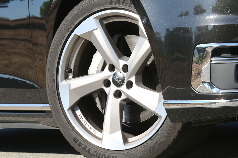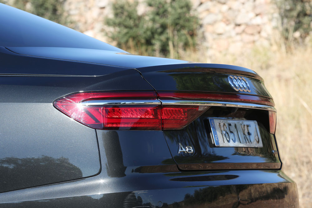 Tres palabras son capaces de describirlo: elegancia, tecnología y diseño. Pocos vehículos visten un traje tan elegante, algo esencial tratándose de un automóvil del segmento F. La compañía de Ingolstadt lo ha conseguido con unos trazos simples pero certeros que maridan a la perfección con los apliques en cromo, las enormes llantas de 20 pulgadas, los grupos ópticos, seña de identidad de este vehículo, y, en el caso de nuestra unidad, el color Gris Vesubio metalizado -1.355 euros-. Además, con la tira continua de luz en la zaga consigue que su anchura parezca aún mayor, por si los 1,95 metros de los que presume no fueran suficientes. También es reconocible por su enorme parrilla singleframe, que ha ido crecido generación tras generación... ¡Y de qué manera! Por ello su frontal arroja aún más garra. Lo que sigue sin entrarme por los ojos, da igual la forma que tengan o el fabricante que las aplique, son las falsas salidas de escape.