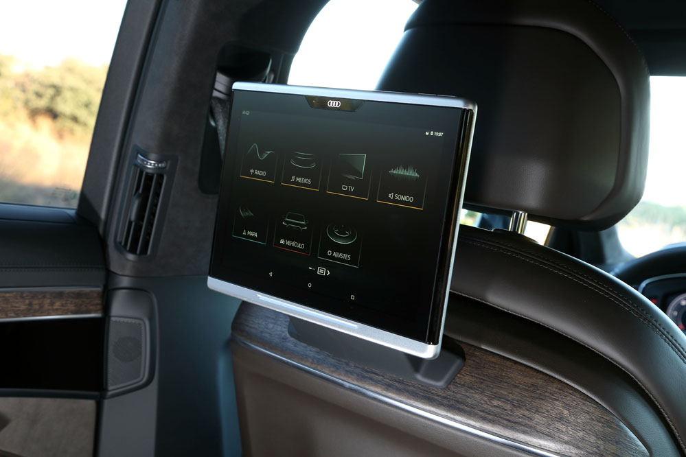 Es hora de comprobar qué me ofrece el coche de la prueba, el Audi A8 50 TDI quattro tiptronic, en la segunda fila. Nada más entrar me topo con las dos pantallas de gran tamaño que están alojadas en los respaldos de los asientos delanteros. Son extraíbles y desde ellas puedo controlar diferentes funciones del vehículo. Como Android es su sistema operativo, tiene todas sus aplicaciones. ¿Quieres ver el correo? Puedes. ¿Quieres ver un vídeo de Youtube? Puedes. ¿Quieres ver la televisión? Que nada ni nadie te prive de ello, excepto la cobertura... Y todo desde unas banquetas que tienen todas las facilidades para hacer tu viaje lo más cómodo posible. Como en las delanteras, tienen función masaje, calefacción, ventilación y climatización independiente. Todo ello se puede dirigir desde el 'Rear Seat Remote', otro artilugio, situado en el reposabrazos central, con pantalla OLED -también lo tiene el BMW Serie 7 que probamos. Tiene el tamaño de un smartphone, es extraíble y desde él puedo tener el control de todas las funciones anteriormente citadas, pero también de las luces de lectura Matrix LED, novedad hasta ahora en el segmento, puesto que me permite dirigir el haz de luz a mi antojo. Y si tienes uno de esos días en que valoras tu privacidad, con un botón alojado en esta especie de consola que también puede hacer la función de reposabrazos, puedes subir las cortinillas de las ventanas laterales y la luna trasera y cerrar la del techo panorámico. ¿Qué te gusta que te miren? Tranquilo, tienes un espejo en el habitáculo a tu disposición para ponerte guapo.