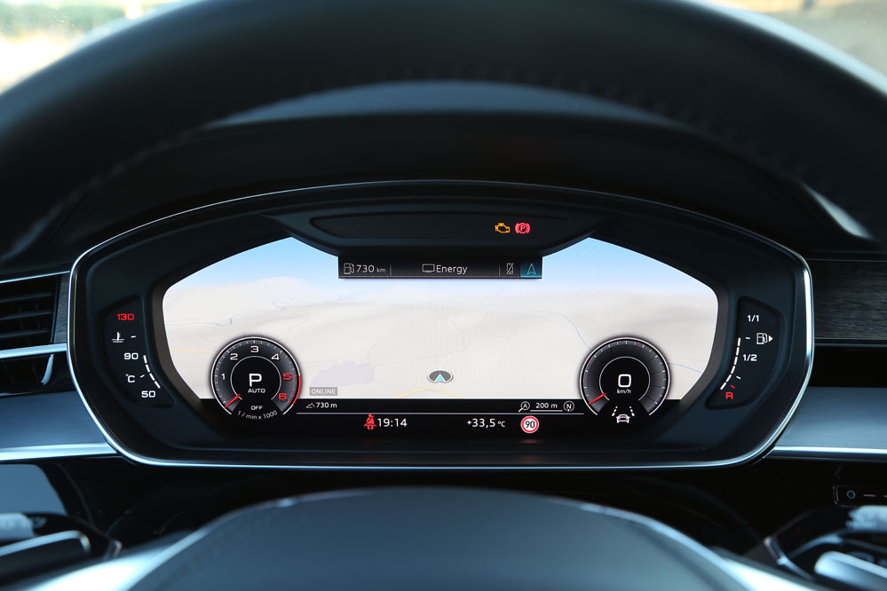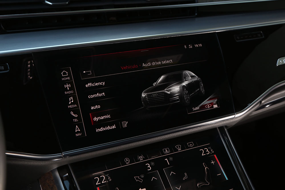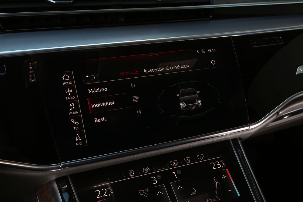 Para poder disfrutar de un coche al antojo del conductor, el Audi A8 50 TDI quattro tiptronic de la prueba tiene diferentes modos de conducción: Efficiency, Comfort, Auto, Dynamic e Individual. Destacaría el primero, que ayuda a mantener a raya el consumo de carburante. Si supero los límites de velocidad de la vía o si ejerzo demasiada presión en el pedal del acelerador, éste vibra para recordarme que hay un rango de mejora en lo que a eficiencia se refiere. También, el sistema eléctrico de 48 voltios permite que el motor se apague en marcha, hasta 40 segundos y solo entre 55 y 160 km/h, cuando no piso ni el acelerador ni el freno. En el momento en que lo hago, el propulsor se vuelve a encender con disimulo. Este sistema, unido al de recuperación de energía me han permitido moverme con un magnífico consumo medio de 6,2 l/100 km.