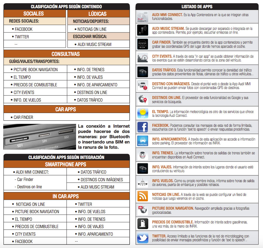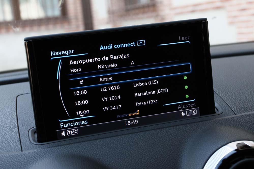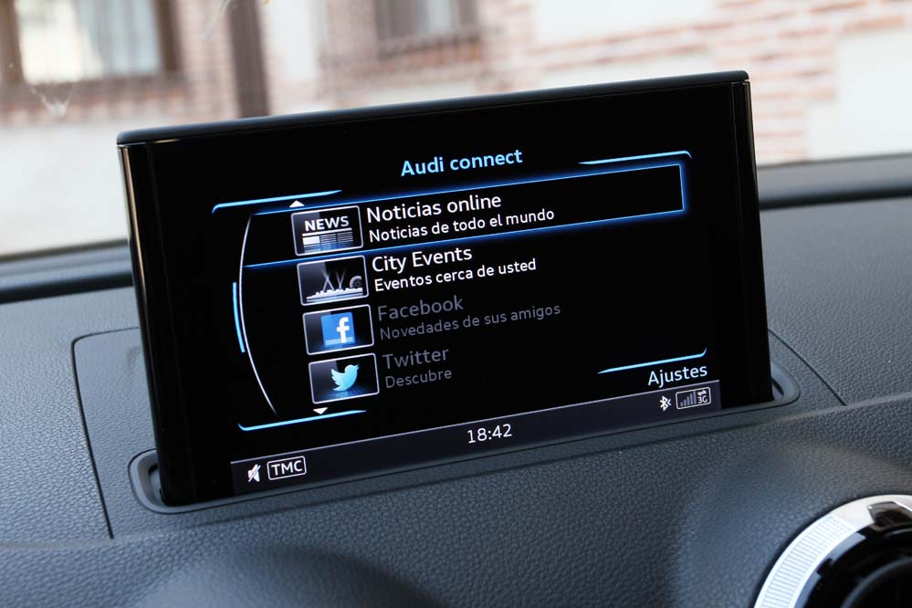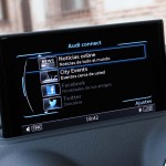 Una vez dentro del vehículo, en el menú Audi Connect se pueden encontrar una serie de aplicaciones embebidas: Noticias on line, Picture Book Navigation, El Tiempo, Precios de Combustible, City Events, Facebook, Twittter, Información sobre vuelos, trenes, viajes y aparcamiento. Además de estas funciones, desde el navegador también se puede acceder a Google Street View y activar la funcionalidad de Tráfico on line.