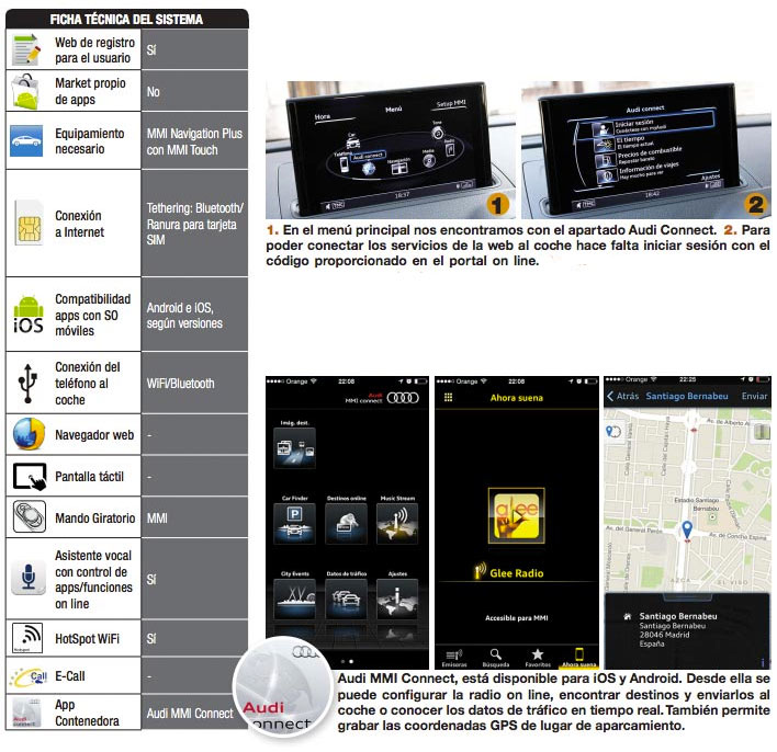 En cuanto a la estructura del sistema, nos encontramos con: una web donde los usuarios deben darse de alta, el propio servicio multimedia del coche y una app contenedora con diferentes funcionalidades, aunque en este caso, las smartphone apps tienen menor peso específico ya que solo es compatible con la app Audi MMI Connect y Audi Music Stream, que se integra dentro de esta también.