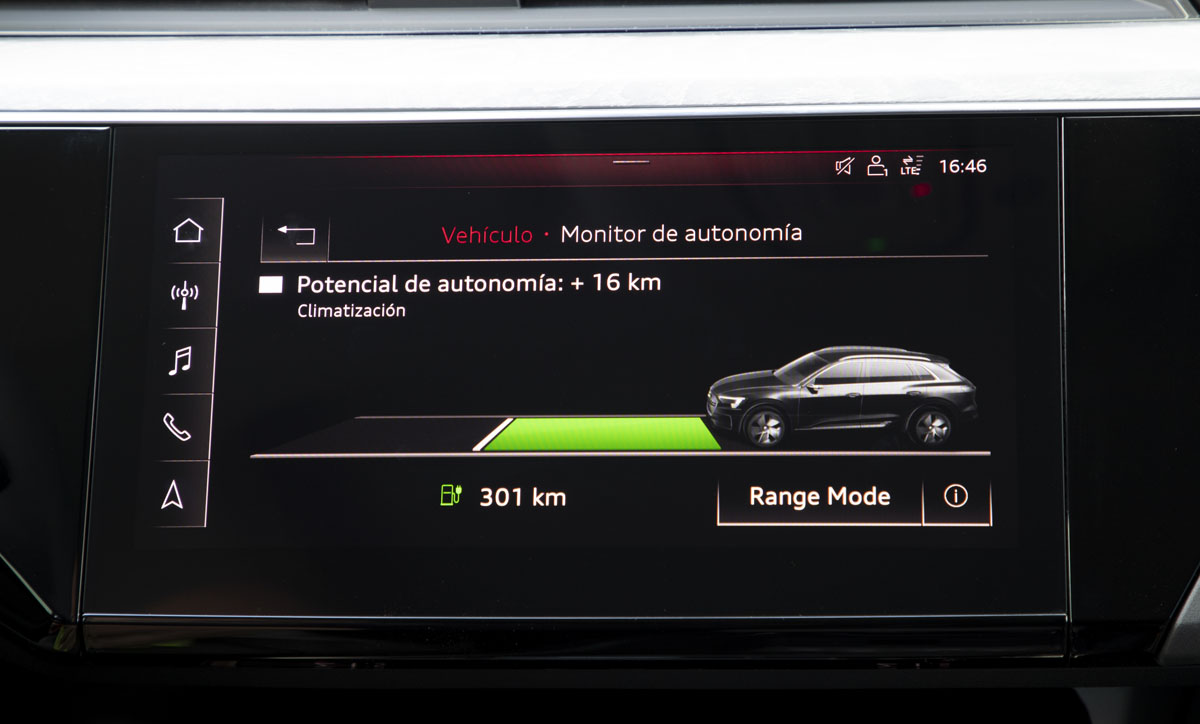 Toca probar el modo más ahorrador. Ese punch del dynamic desaparece, dándome uno más comedido. Todo sea por ahorrar unos kWh. Lo bueno del e-tron es que tiene tres niveles de regeneración con el que al frenar se recargan las baterías. Se accionan mediante las levas del volante y su funcionamiento puede ser automático -el coche lee la carretera- o manual. También uno denominado Range Mode, que modifica todos los parámetros para ofrecer el mayor ahorro. Por ejemplo, en mi caso, con una autonomía de 274 km, conseguía 22 km más. Eso sí, si hace calor, ve despidiéndote del climatizador...
