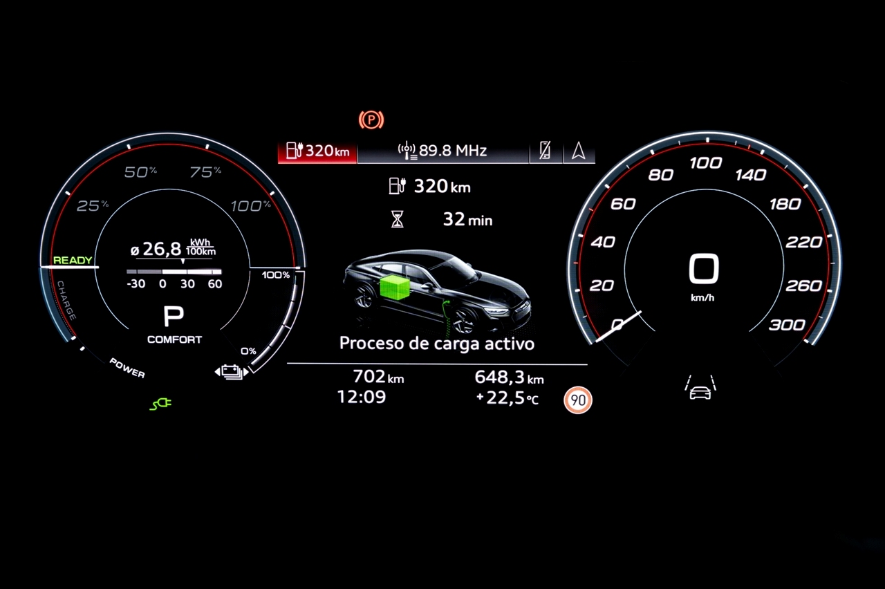Y para rematar este cóctel de sorprendentes datos hay que decir que la batería que monta este modelo tiene 93,4 kW/h brutos, o bien 83,7 kW/h reales. Y entre las facilidades proporcionadas por Audi para cargar el coche, destaca el turbocargador de 400 voltios plus, que permite cargar el vehículo en puntos de 800 voltios (CC) con una capacidad de hasta 270 kW, capaz de cargar hasta el 80 por ciento de la batería en tan solo 22 minutos. Y solo cinco minutos de carga con corriente continua a la máxima potencia bastan para recorrer una distancia de aproximadamente 100 km. La autonomía homologada de este GT eléctrico es de 487 km en ciclo WLTP, aunque luego veremos que se trata de una cifra demasiado optimista, al menos combinando una conducción en ciudad con velocidades constantes en carretera.
