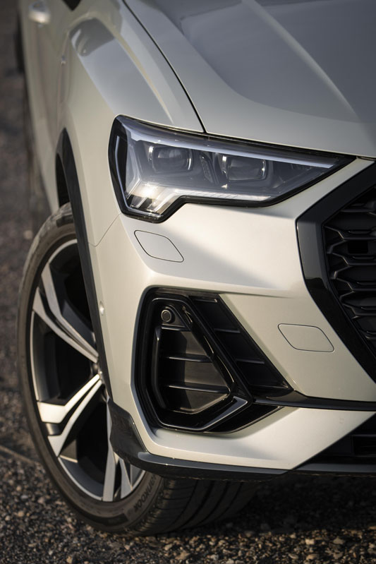 Visto de frente, puede pasar por un Q3, algo que debido al atractivo del modelo lanzado hace casi un año, es un acertado. Adopta los mismos faros Full LED -de serie, aunque de manera opcional se pueden equipar con intermitentes dinámicos o MatrixLED-. También los paragolpes, que son los del acabado S Line del Q3 y que acogen una tomas de refrigeración de forma trapezoidal rodeadas por un marco plateado o negro, dependiendo del acabado. Así como la parrilla octogonal Singleframe, que en el caso del Q3 Sportback sustituye las lamas verticales y horizontales por elementos tridimensionales con un patrón octogonal.
