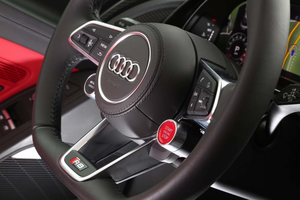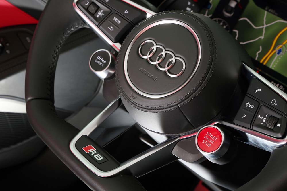 Una vez acomodado, acción que es coser y cantar gracias a los múltiples ajustes de las banquetas, pulso el botón rojo, que como el doctor Víctor Frankenstein es el encargado de dar vida a la bestia. El rugido del V10 hace estremecer a mis vecinos; a mí me estimula, y de qué manera. Su bloque atmosférico respira en mi espalda. Está colocando en posición central trasera, ubicación perfecta para el reparto de pesos. Este propulsor de 5,2 litros, que rinde 540 CV de potencia y 540 Nm de par, es el encargado de que mi cuerpo casi se funda con el asiento gracias a su brutal aceleración, que desde parado y hasta los 100 km/h la realiza en solo 3,5 segundos. Gran parte de mérito la tiene su rapidísimo cambio automático de siete velocidades y doble embrague, única opción en la gama, que ha sido perfeccionado para realizar unas transiciones de forma vertiginosa. Audi ha mejorado lo que parecía inmejorable…