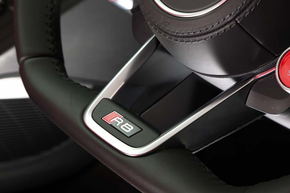 Acomodado en los preciosos bacquets de cuero rojo tras un esfuerzo dada su colocación, que es realmente baja, diviso la parte en la que Audi ha hecho el mayor esfuerzo, y la verdad es que lo necesitaba. Si la consola del anterior R8 (ver prueba Audi R8 LMX) tenía un aspecto añejo, normal tras casi diez años en el mercado, la del Audi R8 2015 ha aplicado la máxima de 'menos es más'. Es digna de exposición, porque a pesar de ser minimalista, tienes todas las funcionalidades a mano. Su diseño es fascinante, muy moderno, y todo ello sin caer en la extravagancia por las que sí optan otras marcas. Marida a la perfección con el volante, que como el del Audi Sport quattro concept equipa los botones de encendido del motor y del ‘Drive Select’’ bajo los brazos laterales del volante, y con el cuadro de instrumentos, que es totalmente digital y tiene 12,3 pulgadas. El puesto de conducción, por su forma, me recuerda al de un caza. Mis piernas están rodeadas, y del túnel central, que es alto y ancho, emerge una palanca de cambios que parece la de un avión de combate. Los ajustes son excelentes, los materiales de primera, como la fibra de carbono de las toberas del sistema de climatización, el cuadro de instrumentos o el túnel central; la Alcantara en color gris del techo o la piel ‘Napa fina’ de los asientos. Todo está orientado hacia el conductor. ¡Chapeau por la gente de Audi!