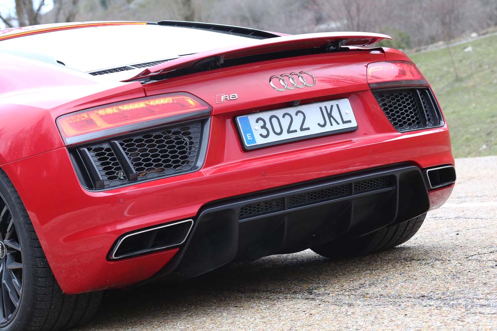 Sigo exprimiendo el enorme bloque que respira detrás de mí. Solo por su sonido sé que este motor es capaz de transportarme a un estado cercano al éxtasis. Reduzco marchas y la subida correspondiente de vueltas viene acompañada de detonaciones que son expulsadas por sus escapes trapezoides, colocados en los extremos de la zaga. Creo que el paraíso no debe distar mucho de la sensación que estoy viviendo… Además, con su sistema Star-Stop, cada parada y posterior arranque hacen estremecer mis sentidos. Por si no queda claro qué maquina es la encargada de mover el Audi R8 V10 540 CV 2015 de la prueba, cosa que permítame que dude, solo hace falta echar un vistazo por el retrovisor para ver el reflejo del motor, donde se puede leer con nitidez V10 FSI. No hay más que decir…