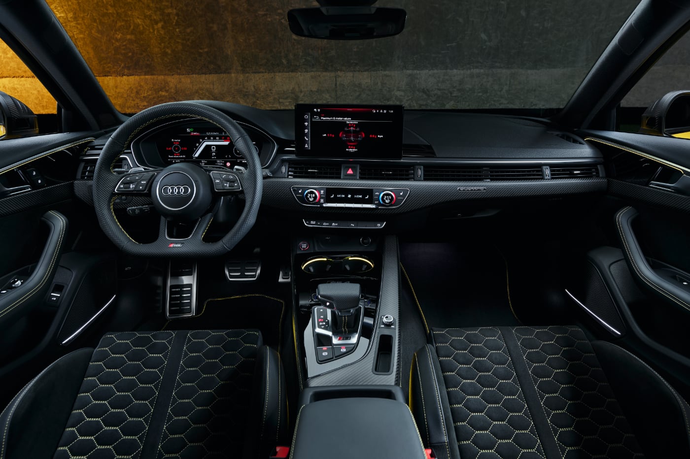 Abro la puerta, y lo primero que me encuentro son unos fantásticos asientos tipo bacquet con costuras en amarillo y patrón nido de abeja en su tapicería de cuero y piel vuelta. Recuerdo perfectamente los del RS4 Avant B5. No agarraban tan bien el cuerpo como en el nuevo, pero su imagen era igual de sugerente a pesar de no tener tantos soportes ni el respaldo de carbono. Por cierto, no falta el logotipo RS en el respaldo.