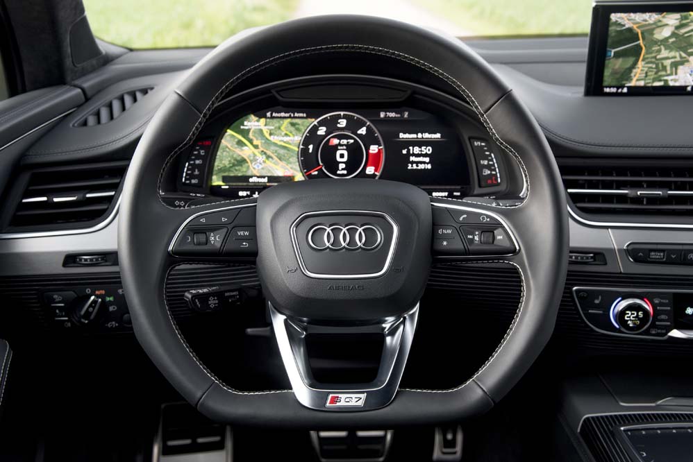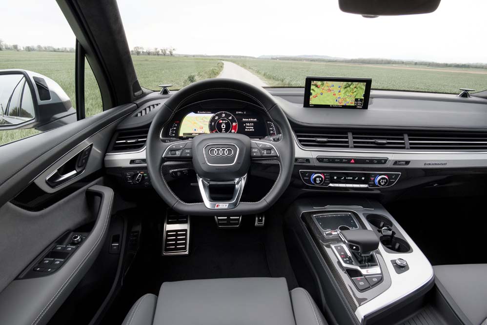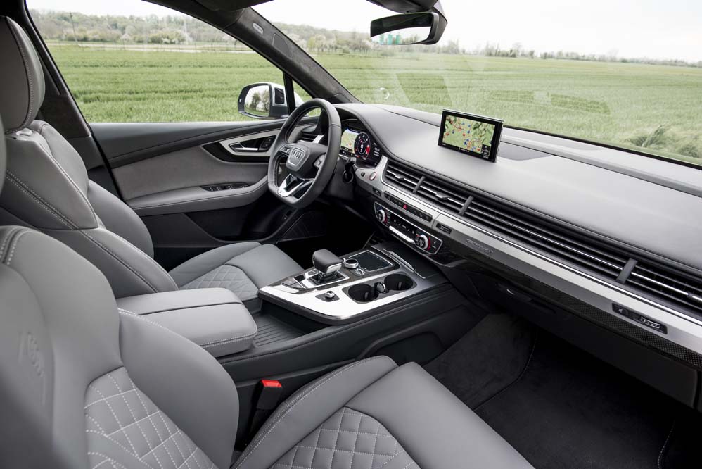 Abro la puerta, que me sorprende por su ligereza, ya que es uno de los elementos sobre los que se ha trabajado para rebajarle peso al conjunto, y desde sus cómodos asientos diviso el interior. Pocos cambios respecto al Q7, solo los anagramas SQ7 se diferencian del modelo sobre el que se desarrolla. Como él, adopta materiales nobles, ajustes excelentes y exhibe una enorme calidad percibida, características que le encumbran como modelo a seguir. También contribuyen, cómo no, el sistema MMI Navegación plus y el Audi virtual cockpit, formado por una pantalla de 12,3 pulgadas y que es de serie en España.