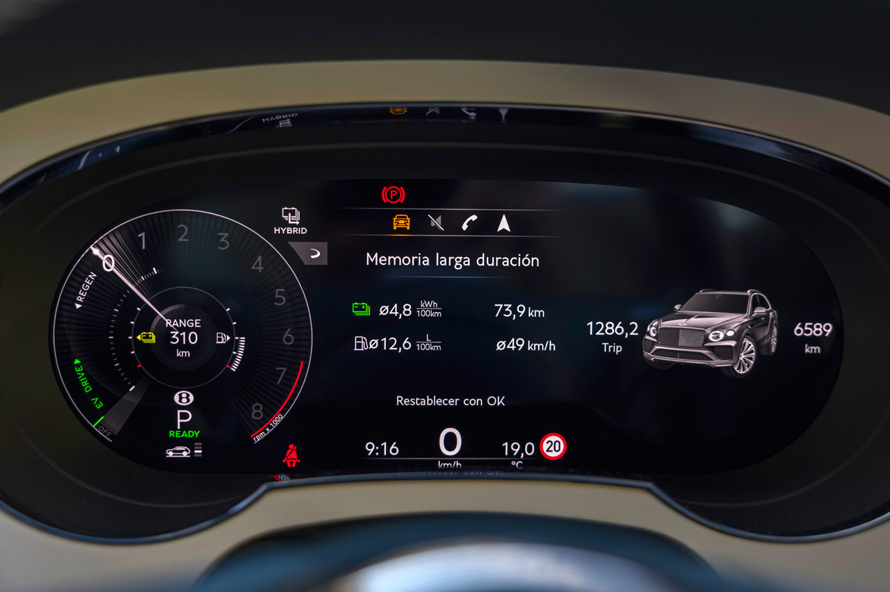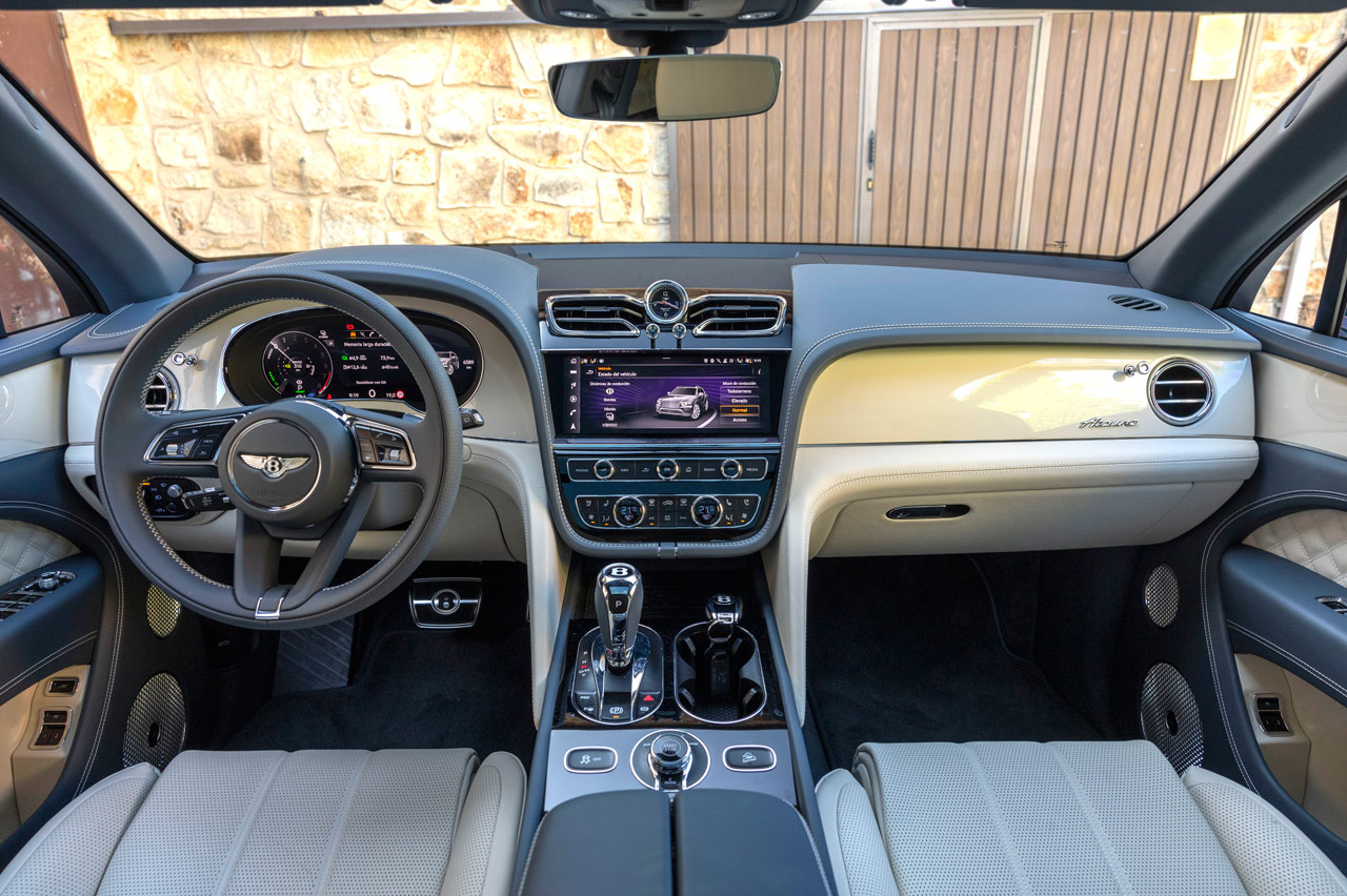 En concreto, la unidad de pruebas del Bentayga trae los cambios recibidos en el restyling de 2021, con un exterior con nuevos grupos ópticos y un interior más tecnológico con el cuadro de instrumentos digital de 12,3 y la pantalla del sistema de infoentretenimiento de 10,9". También, con los de 2024, con leves retoques estéticos, pero una mejora de su sistema híbrido enchufable.
