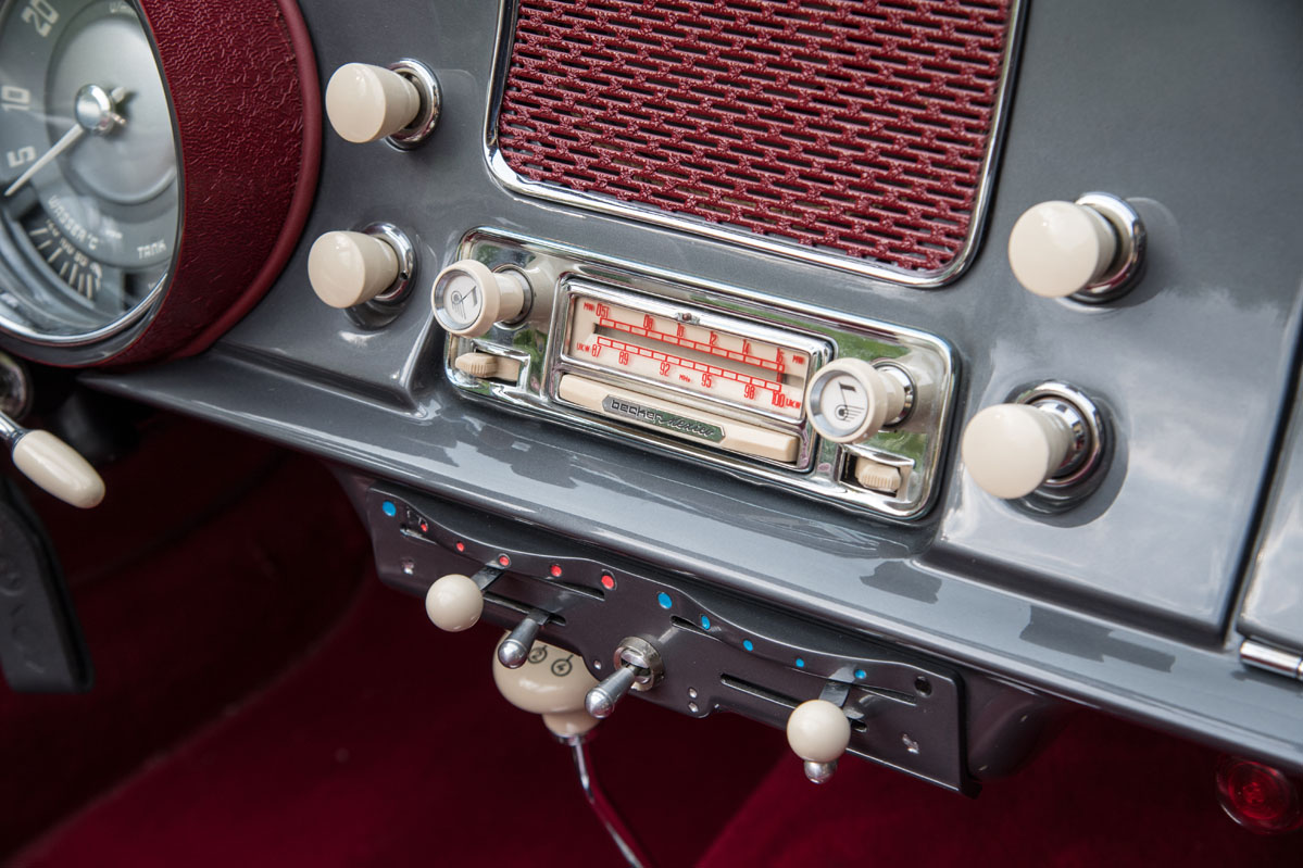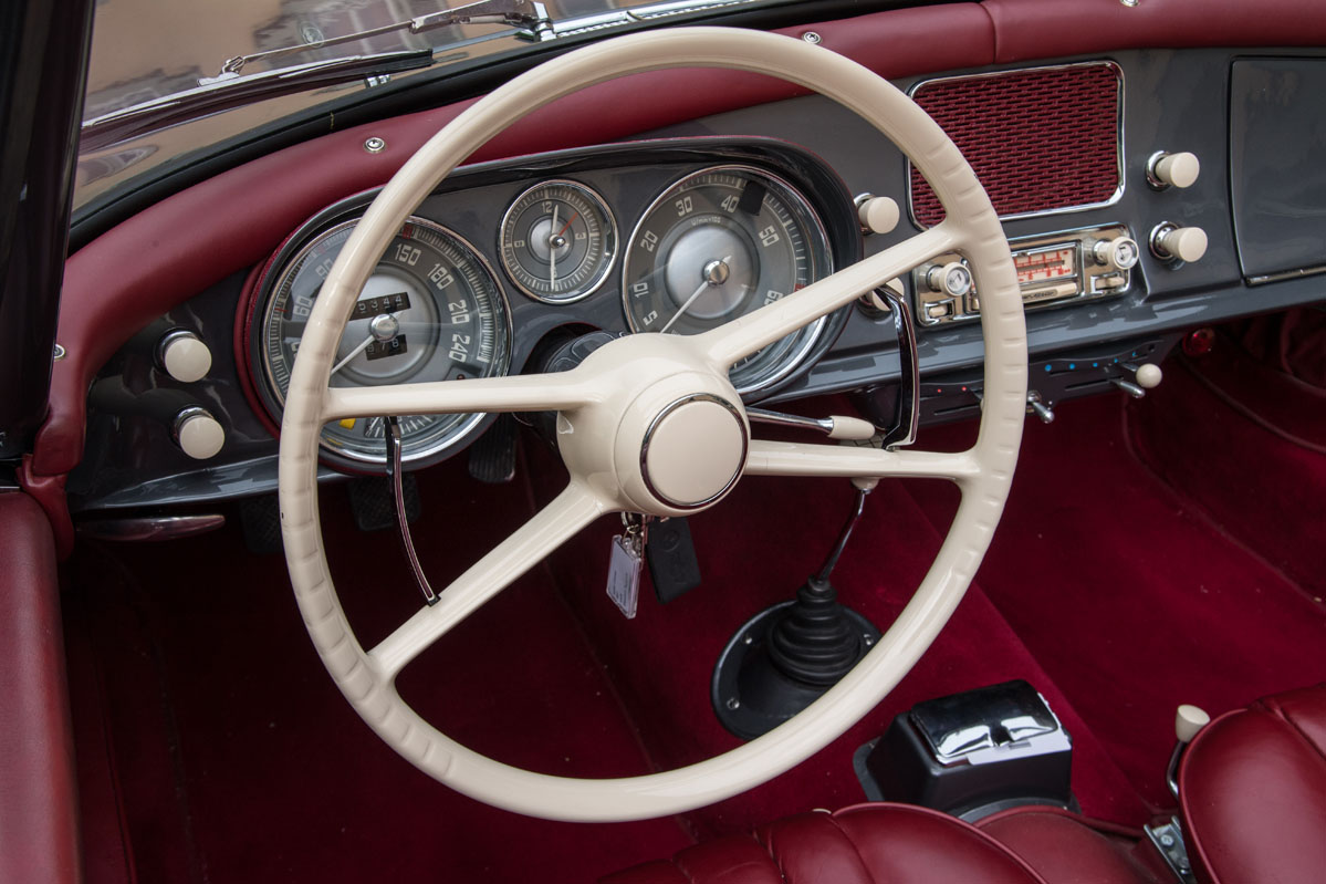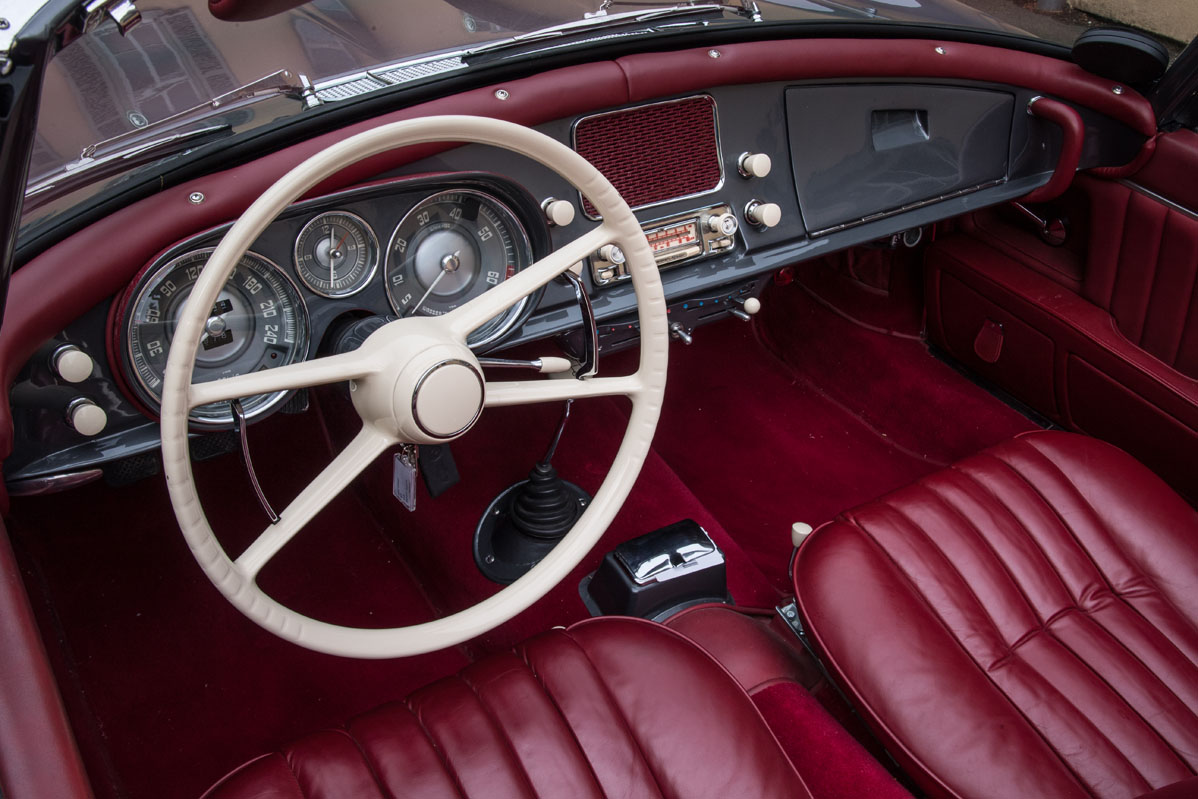 Al interior accedo abriendo la pequeña, aunque ancha, puerta y quedo gratamente sorprendido por el espacio y la comodidad que ofrece siendo un roadster de los años 50. Sus asientos son amplios y mullidos, pero me resulta extraño no poder apoyarme en el reposacabezas.