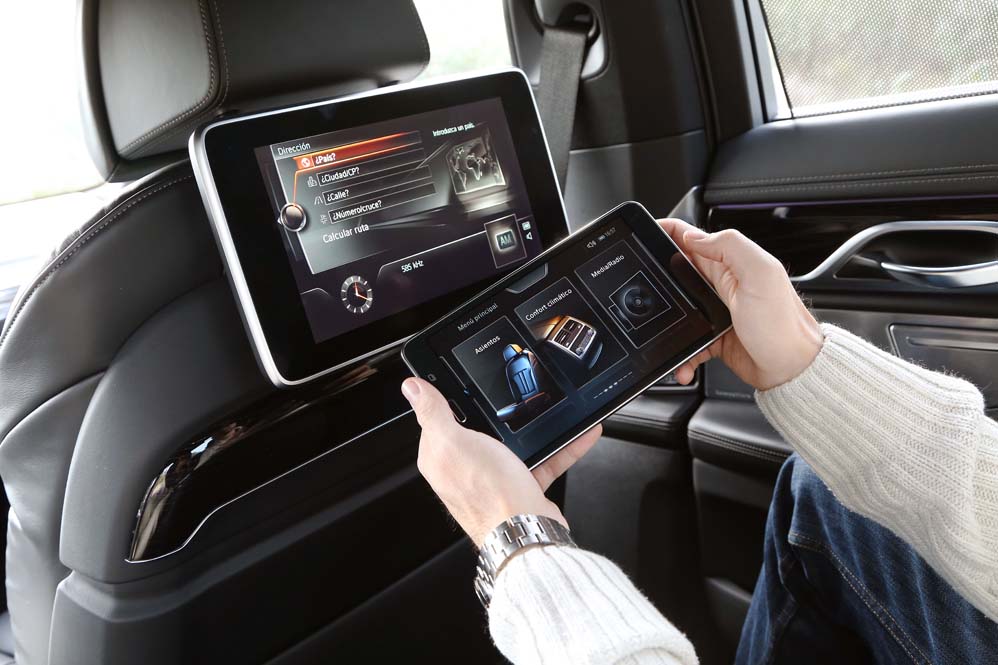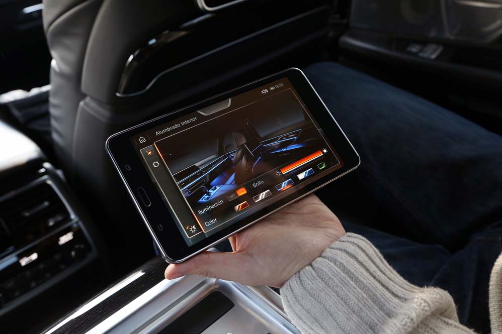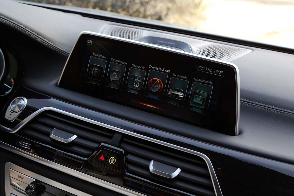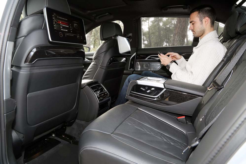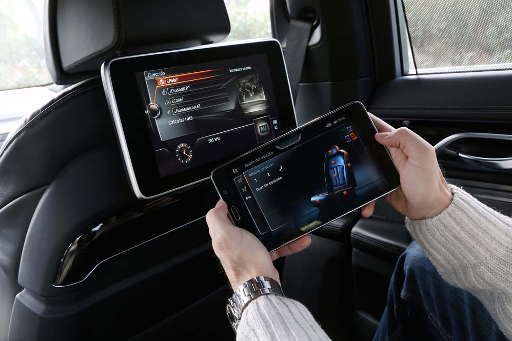 Y si me he quedado sorprendido por lo que he encontrado en las plazas delanteras, mi asombro va a más en las traseras: ventilación, calefacción y masaje se complementan con las dos pantallas de 10 pulgadas situadas tras los respaldos anteriores, desde las cuales se manejan muchas funcionalidades del coche, además de ver películas o la televisión; y todo ello accesible desde el BMW touch Command (579,92 euros), una tableta extraíble Samsung de 7" con sistema operativo Android alojada en el reposabrazos central. Pero todo ese boato se ve empañado por el espacio, y es que para ser una berlina de representación del segmento F, lo veo justo, sobre todo en altura. Creo que 90 centímetros es una cifra pobre, muy pobre. Harina de otro costal es el reservado a los hombros y a las piernas, y si te parece justo, que lo dudo, siempre puedes optar por la carrocería de batalla larga. Y es que, si hablamos de comodidad, nunca es suficiente…