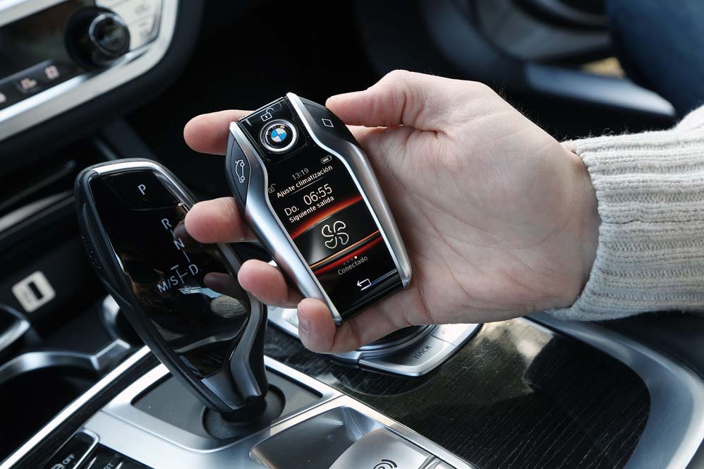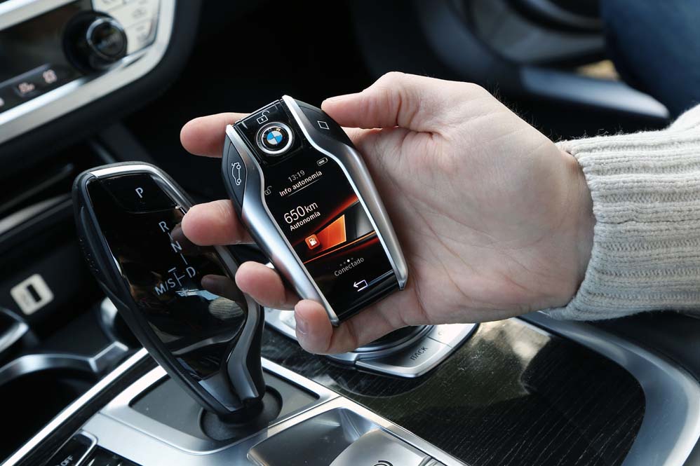 Si por algo presume este nuevo Serie 7 es por la tecnología que puede equipar. Y es que desde el minuto uno me doy cuenta de que estoy ante uno de los vehículos con los sistemas más sofisticados del mercado, que, nunca mejor dicho, están al alcance de mi mano. Porque en ella sujeto la llave, una llave fuera de lo común que parece un auténtico smartphone, y no lo digo por el tamaño, que también, sino por la pantalla táctil a color y las funciones que puedes realizar desde ella a golpe de dedo. Es realmente sencillo comprobar si las puertas y las ventanillas están correctamente cerradas, el estado del sistema de iluminación, programar la ventilación y chequear el nivel de autonomía o el estado del aceite. Por desgracia, en nuestra unidad de pruebas la llave del Serie 7 2015 no podía realizar las 10.000 funciones ejecutables. Controlar el aparcamiento por control remoto es una de estas sorprendentes acciones, y por ella tendrás que desembolsar 650,93 euros.