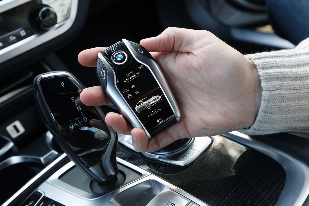 Si por algo presume este nuevo Serie 7 es por la tecnología que puede equipar. Y es que desde el minuto uno me doy cuenta de que estoy ante uno de los vehículos con los sistemas más sofisticados del mercado, que, nunca mejor dicho, están al alcance de mi mano. Porque en ella sujeto la llave, una llave fuera de lo común que parece un auténtico smartphone, y no lo digo por el tamaño, que también, sino por la pantalla táctil a color y las funciones que puedes realizar desde ella a golpe de dedo. Es realmente sencillo comprobar si las puertas y las ventanillas están correctamente cerradas, el estado del sistema de iluminación, programar la ventilación y chequear el nivel de autonomía o el estado del aceite. Por desgracia, en nuestra unidad de pruebas la llave del Serie 7 2015 no podía realizar las 10.000 funciones ejecutables. Controlar el aparcamiento por control remoto es una de estas sorprendentes acciones, y por ella tendrás que desembolsar 650,93 euros.