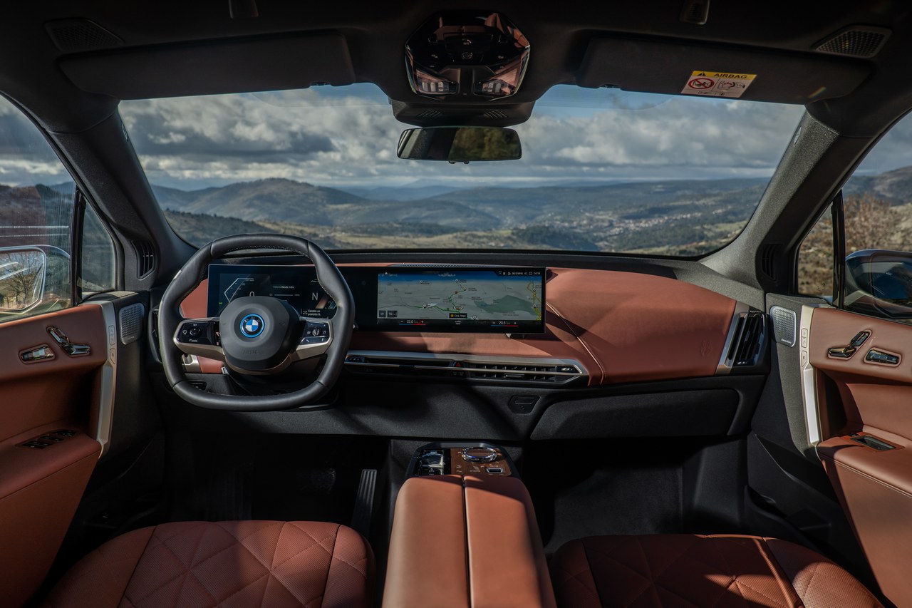 Prácticamente no hay botones físicos más allá de los del volante o propios del sistema iDrive -que ni siquiera son botones como tal, pues están integrados en un panel táctil con un acabado que imita madera-. La información y los controles se aglutinan en las dos enormes pantallas que hacen las veces de cuadro de mandos (12,3”) y de soporte para el sistema de información y entretenimiento (14,9”). Y todo ello va acompañado, al menos en el caso del BMW iX xDrive40 que probado, de un interior que presenta un acabado de tela y microfibra con unos colores inspirados en el interior de los hoteles boutique -la unidad de las fotos presenta un tapizado de cuero-.