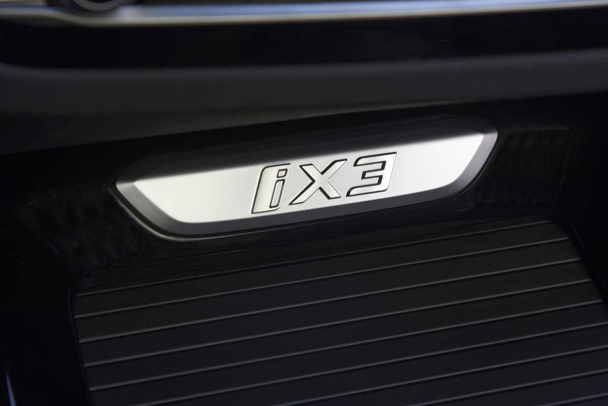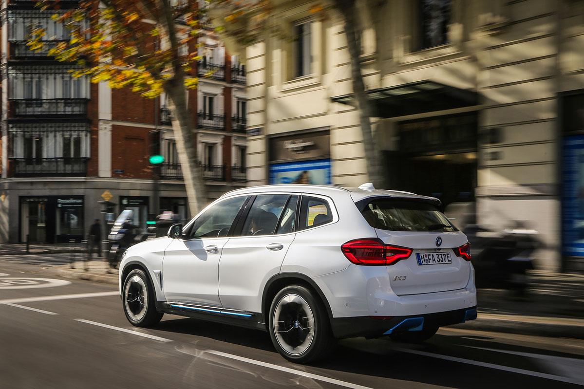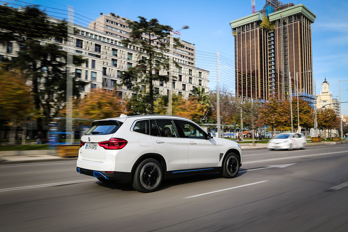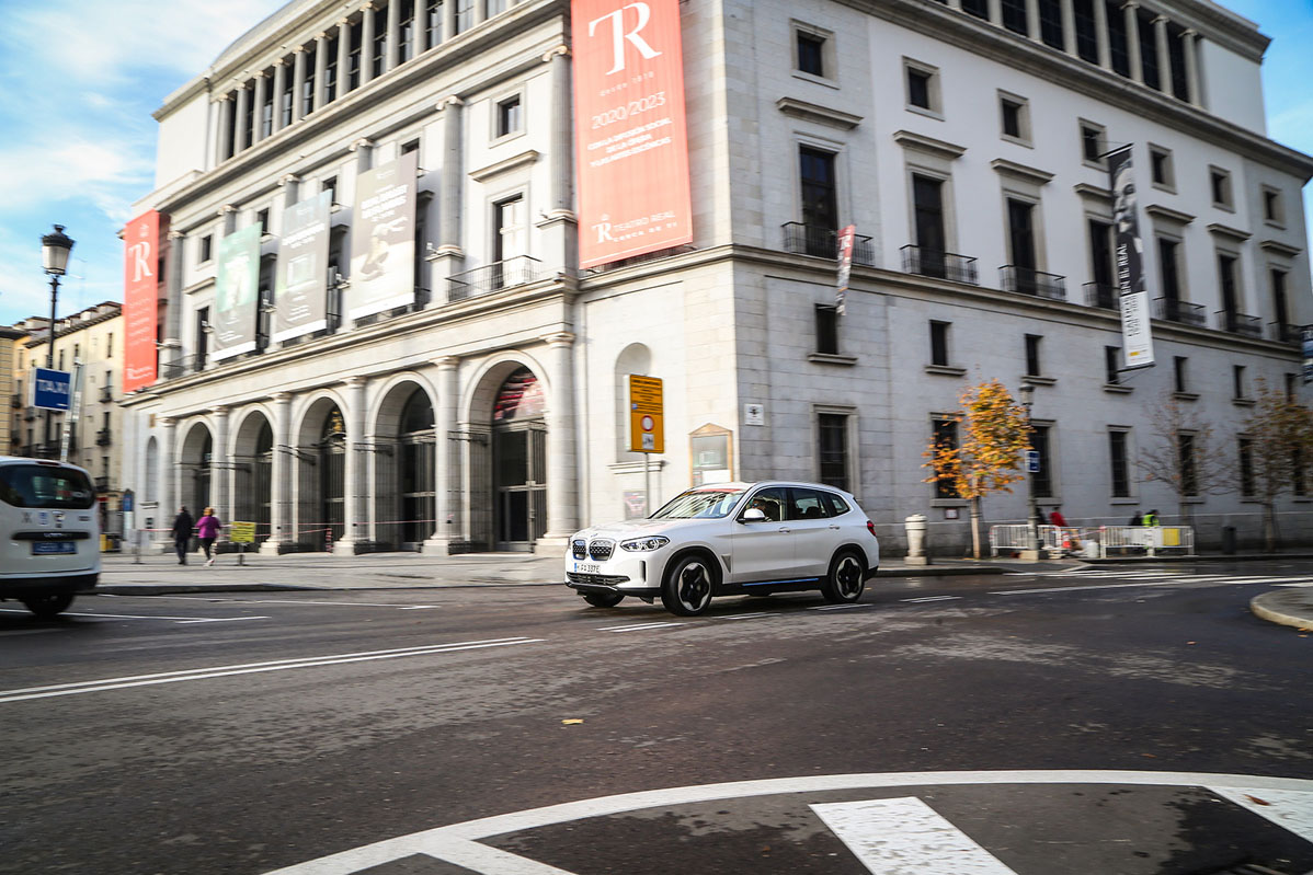 La unidad que tengo enfrente es un vehículo pre-serie, por lo que no es el coche final, aunque sí es muy cercano, como me informa Borja Hormigos, jefe de Prensa de la firma en España. Da igual, porque el diseño es el mismo, por lo que adopta rasgos que le diferencian del X3 como la parrilla, que apenas tiene refrigeración, algunos elementos en color azul, tanto en la parte delantera, como en la lateral y en la trasera; y las llantas de 20”, que son un 15% más ligeras y, lo que es más importante, aerodinámicas, por lo que mejoran un 5% el flujo aerodinámico y, con ello, aumenta la autonomía en 10 kilómetros. Que no lleve escape, como coche eléctrico que es, no llama tanto la atención, porque algunos fabricantes están prescindiendo de ello en automóviles con motor de combustión o, peor aún, montando colas falsas.