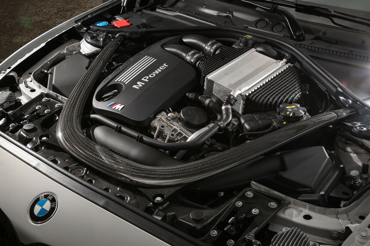 Continúo la prueba del BMW M2 Competition desgranando el cambio más importante: su motor. Para ello abro el capó. Su seis cilindros en línea con un turbo ha sido sustituido por otro con la misma configuración, la misma cilindrada, 2.979 cc, pero sobrealimentado por dos turbocompresores MonoScroll. Es el S55 y proviene de la dupla M3/M4, de ahí que su potencia se incremente hasta los 411 CV y que su par haga lo propio hasta rendir 550 Nm -por los 370 CV y 465 Nm del M2-. Del vano donde va perfectamente encajado este portentoso motor me llama la atención la barra de torretas, que está fabricada en plástico reforzado con fibra de carbono, por lo que solo suma al peso del coche 1,5 kg.