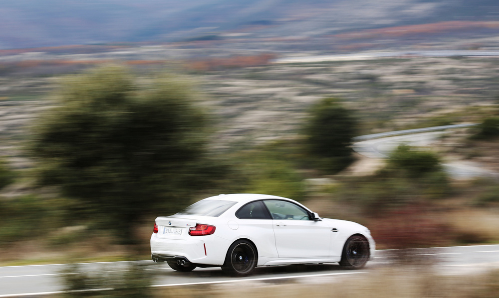 Sigo adentrándome en la sierra y, cuando quedan muy pocos kilómetros para alcanzar la frontera abulense, la carretera comienza a tornarse más delicada… y exigente. En este terreno la unidad de nuestra prueba del BMW M2 también se muestra verdaderamente colaborativa, aunque lo cierto es que el umbral de los gritos baja considerablemente: ahora un mal golpe de gas puede terminar tus dientes llenos del mismo pasto que alimenta a las ganaderías locales, pero gracias a un comportamiento verdaderamente noble será difícil que lo consigas. Salvo que seas muy torpe.