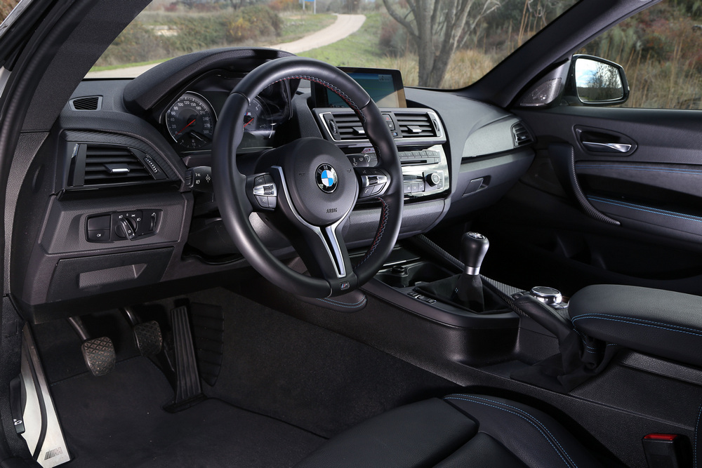 Cuando salto —porque eso fue literalmente lo que ocurrió debido a las ganas que tenía de ponerlo en marcha— al interior del BMW M2 no puedo evitar llevarme una pequeña desilusión: fiel a la sobriedad propia de todos sus compañeros de gama, el más pequeño de los M tiene un habitáculo demasiado discreto con sólo algunos elementos diferenciadores con respecto a un Serie 2 normal que, todo sea dicho, están elegidos con muy buen gusto.