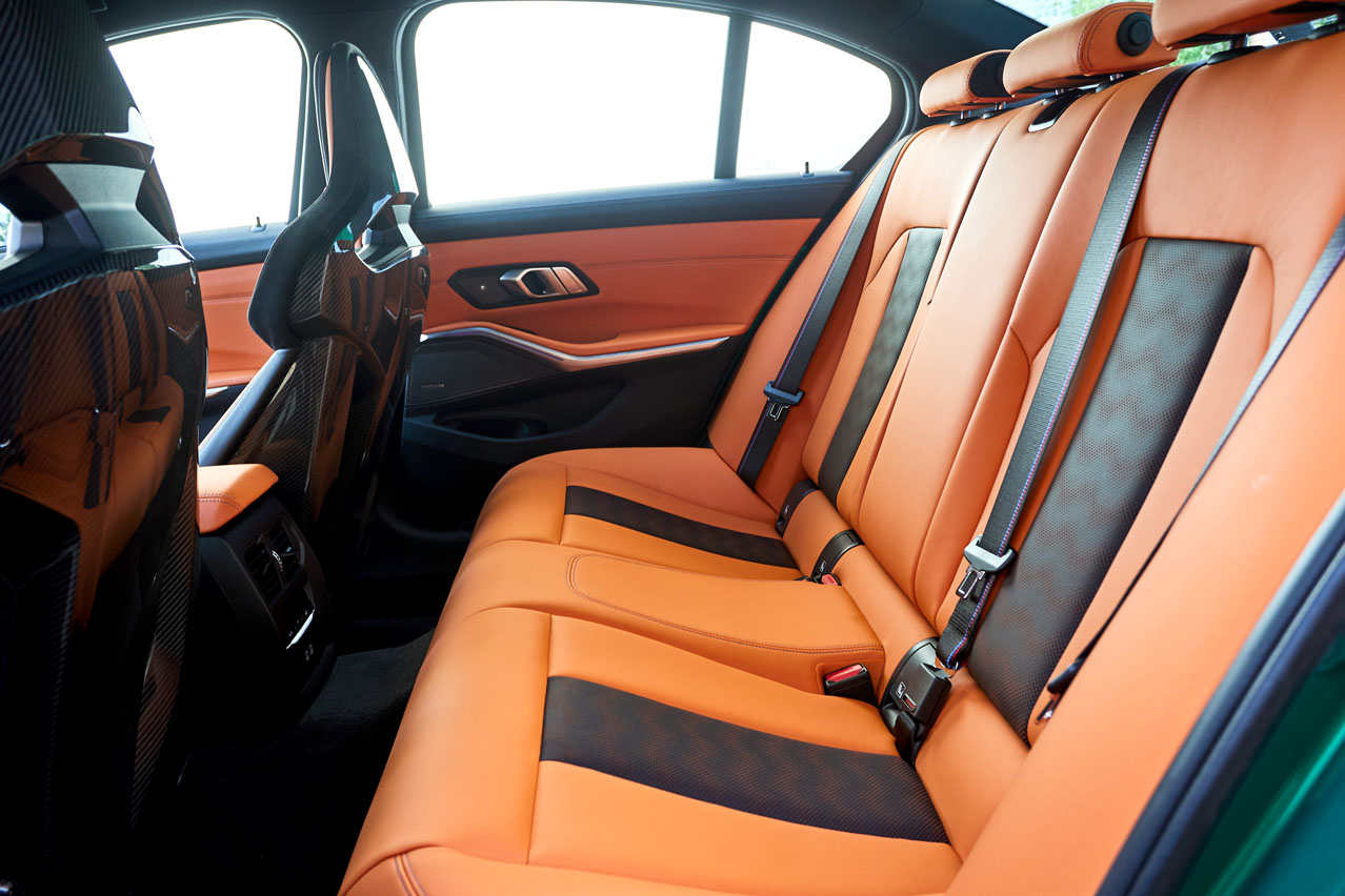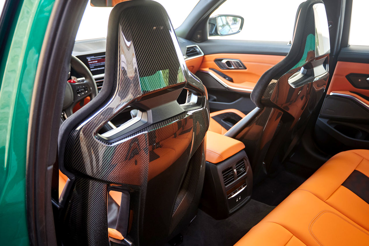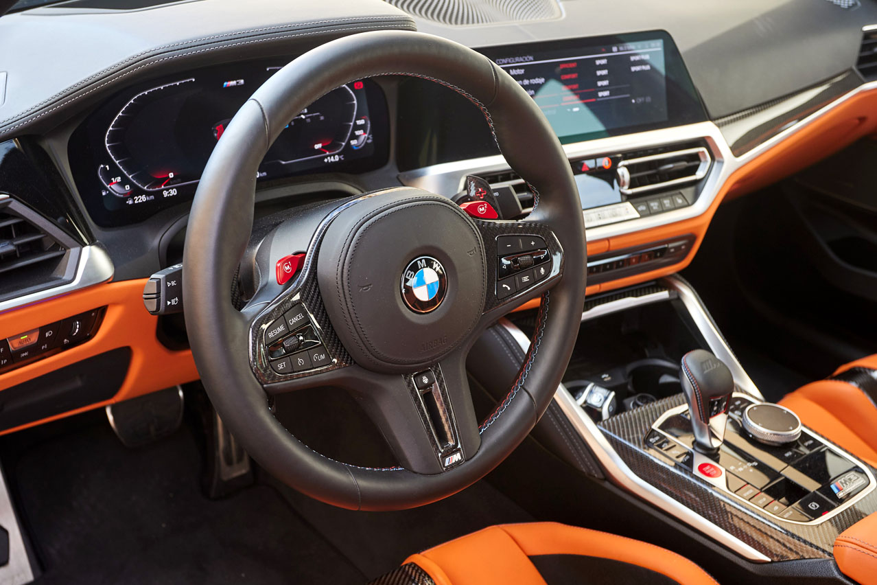 Es abrir la puerta y ver esos espectaculares asientos tipo backet y es caer rendido a sus pies. También caer, literalmente, para sentarte, porque están ubicados bien abajo. De hecho, van más cerca del piso que los de serie, además de ser 9,6 kilogramos más ligeros al estar reforzados con fibra de carbono. Están preparados para instalar arneses y la almohadilla del reposacabezas puede ser desmontada quitando dos tornillos escondidos en la parte inferior para hacer más cómodo el uso de caso en circuito. No les falta de nada porque presume de regulación eléctrica, iluminación en el logo M3 e incluso calefacción. A pesar de tener una banqueta con un mullido bastante cómodo, si vas a pisar la pista de Pascuas a Ramos, te recomiendo que optes por los nórmales, porque tanto el acceso como la salida del vehículo no es una tarea sencilla... y más a mi edad. Eso sí, tu cuerpo es agarrado con más intensidad en los virajes que una pareja de quinceañeros en sus primeras citas. Porque de su aspecto no hace falta que te comente nada; las imágenes hablan por sí solas.