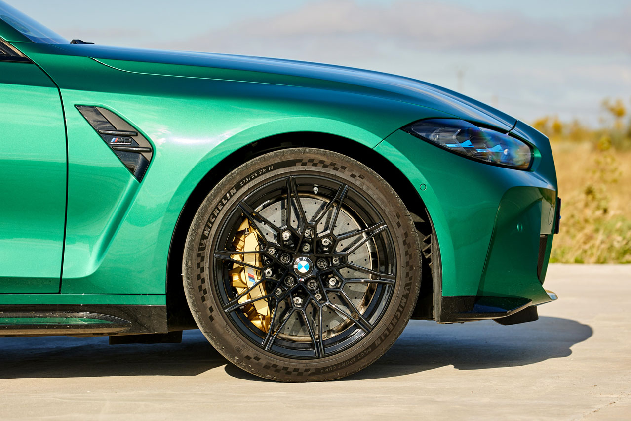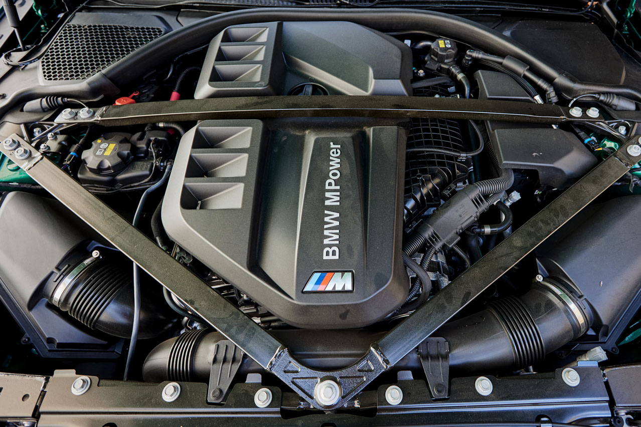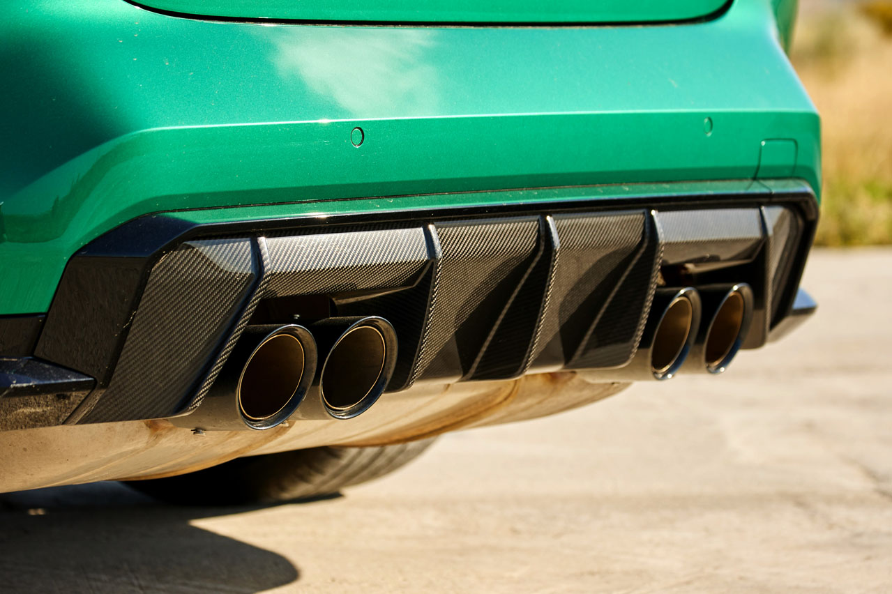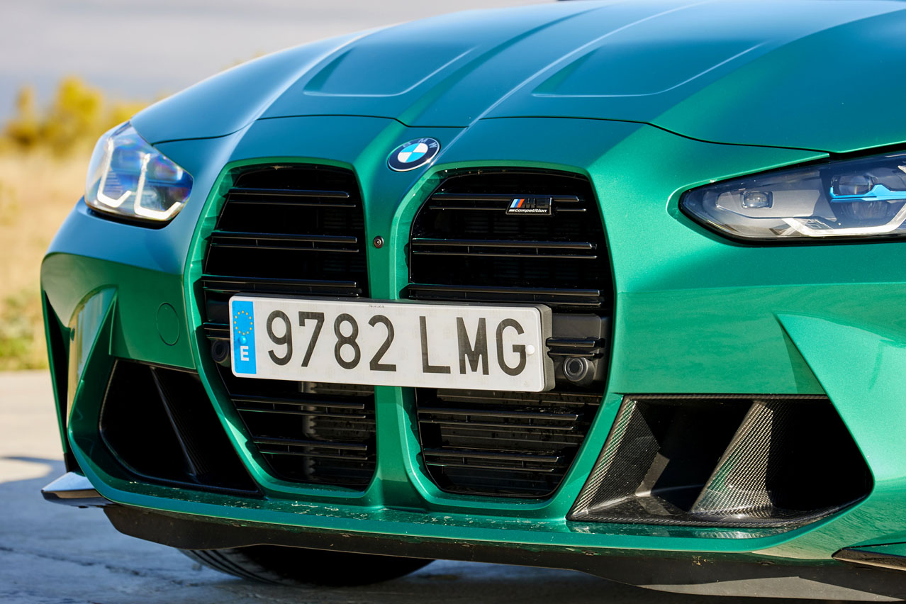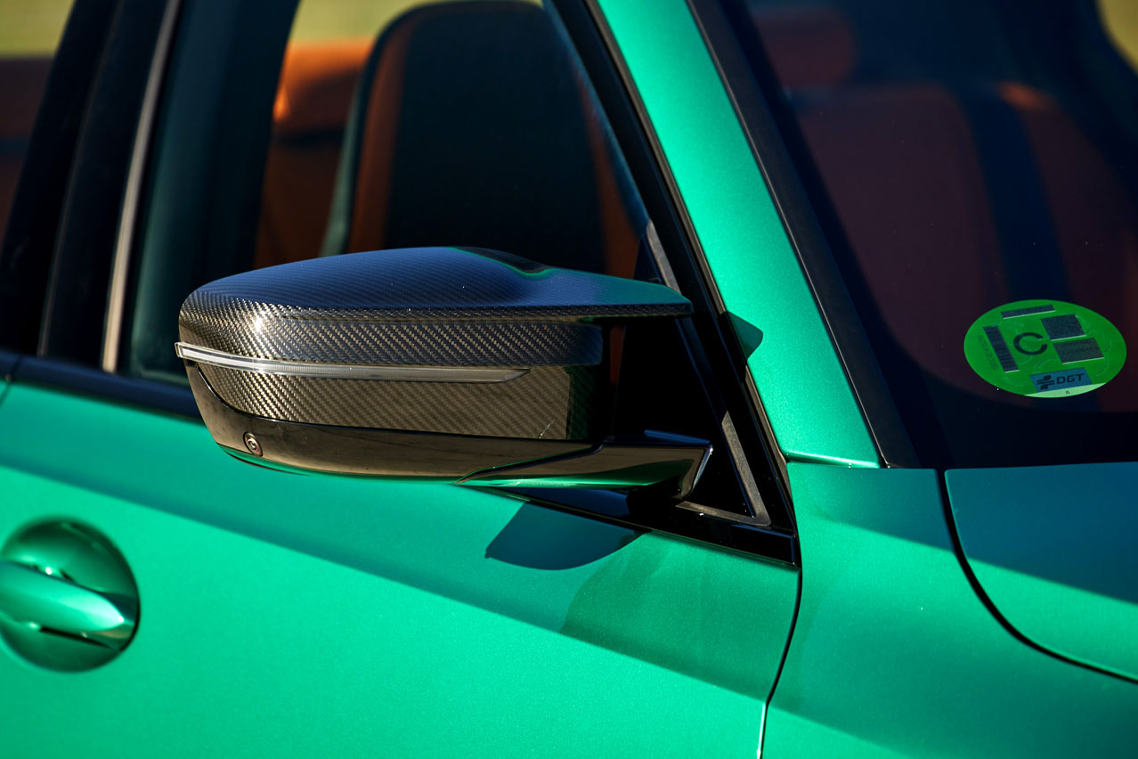 La firma de Munich le ha dado un giro considerable al diseño de su producto estrella. En él entran los tan 'analizados' riñones. No son de mi gusto, pero he de reconocer que lucen mucho mejor en vivo. Quizá BMW los ha diseñado así, tan grandes, para que puedas llegar a divisar la obra de arte que esconde y que ha evolucionado: su motor S58, el seis cilindros en línea que ha surgido de la modificación del B58 y que incorpora dos turbos más grandes, la posibilidad de soportar más presión de inyección -hasta 350 bares- gracias a que su culata ha sido creada en una impresora 3D, y un árbol de levas que ha sido tomado prestado del BMW M4 GT3, el vehículo de competición. Pero de él y de sus 510 CV y 650 Nm de par te hablaré un poco más adelante. Porque no puedo dejar pasar los ensanchados pasos de rueda, los musculosos paragolpes, el delantero con amplias tomas de refrigeración y el trasero con un difusor funcional que alberga cuatro salidas de escape de 100 milímetros cada una; las nervaduras del capó, los espejos retrovisores exteriores de doble brazo, seña de identidad de esta versión, y el sutil alerón de la tapa del maletero. El punto extra se lo da el nuevo color Verde Isla de Man (1.168 euros) -recuerda que muchos de los colores usados por BMW tienen nombre de circuito-, que viste el coche y que encaja como un traje a medida.