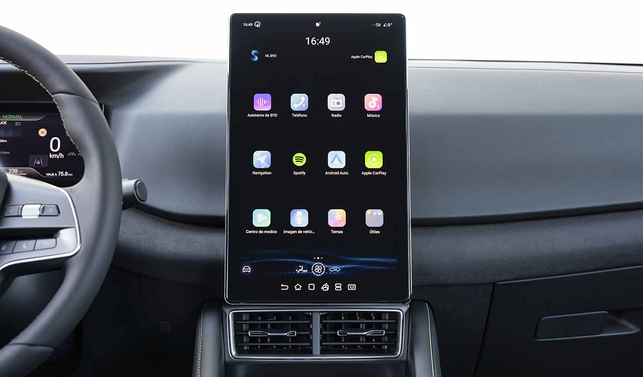 En la versión que he probado los asientos son muy cómodos y tienen regulación eléctrica, y el volante es muy ergonómico, con botones físicos. La instrumentación está reflejada en una pantalla que roza las 9 pulgadas, y la multimedia puede tener 10,1 o 12,8 pulgadas, dependiendo de la versión. Gira, como las vistas en otros coches de BYD, lo cual hace que puedas visualizarla tanto en vertical como en horizontal.