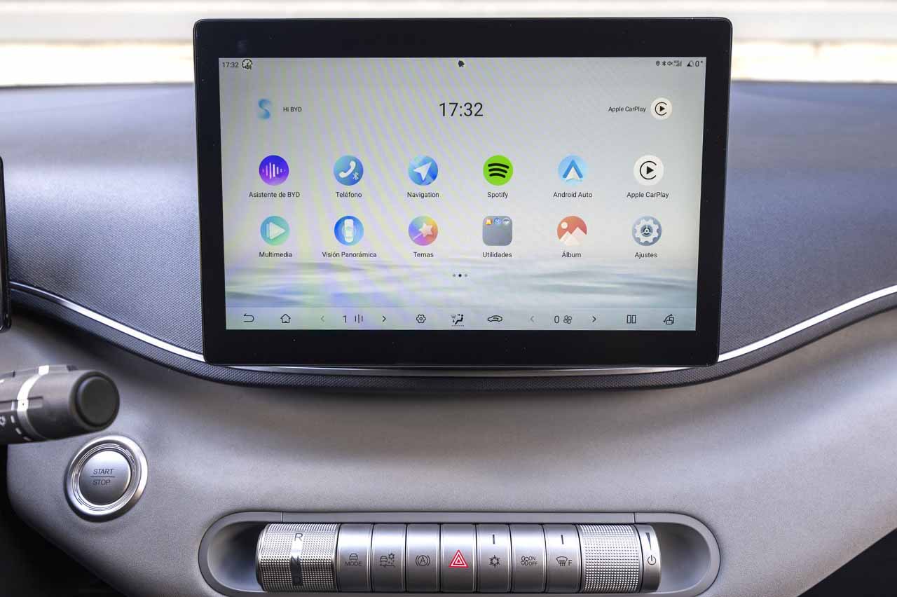 El volante tiene botones físicos y la pantalla multimedia, que es giratoria como en el resto de los BYD (minipunto de originalidad), tiene 10,1 pulgadas y conectividad total. Su manejo es sencillo e integra los mandos del climatizador, pero hay accesos directos, el control físico del audio y el selector de la transmisión justo debajo de la misma. Muy bien, así evita las distracciones al volante.
