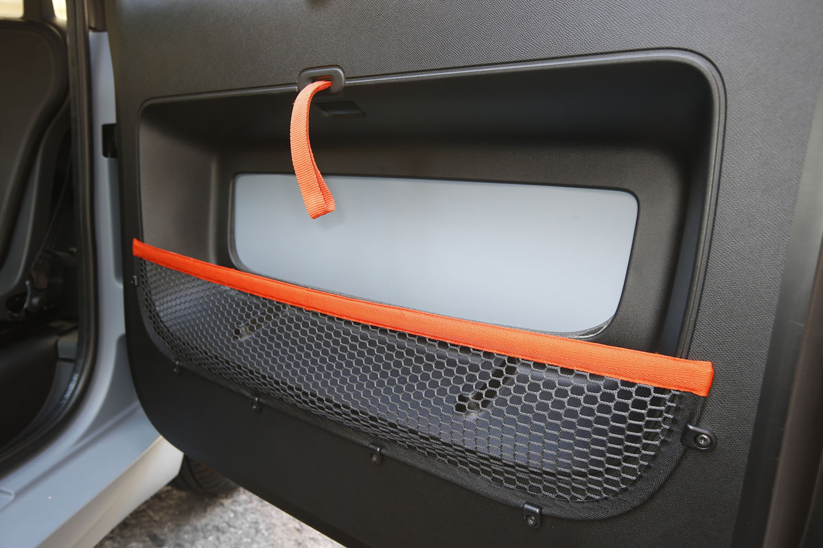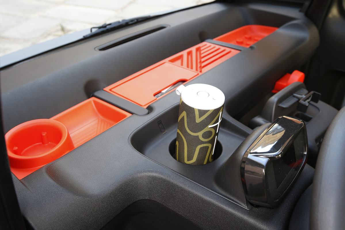 El salpicadero cuenta con una enorme bandeja portaobjetos que va de lado a lado; las puertas, con amplias bolsas. Y detrás del cuadro de instrumentos, un soporte para colocar el altavoz portátil, que, por cierto, puede sumergirse bajo el agua. Asimismo, el asiento del acompañante está un poco más retrasado para que los hombros de los dos pasajeros no se molesten y para dejar en los pies un hueco generoso. Tanto que en él cabe un trolley de viaje.