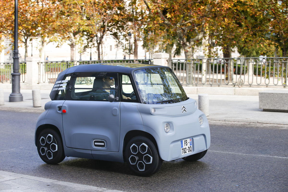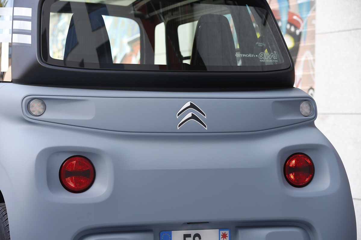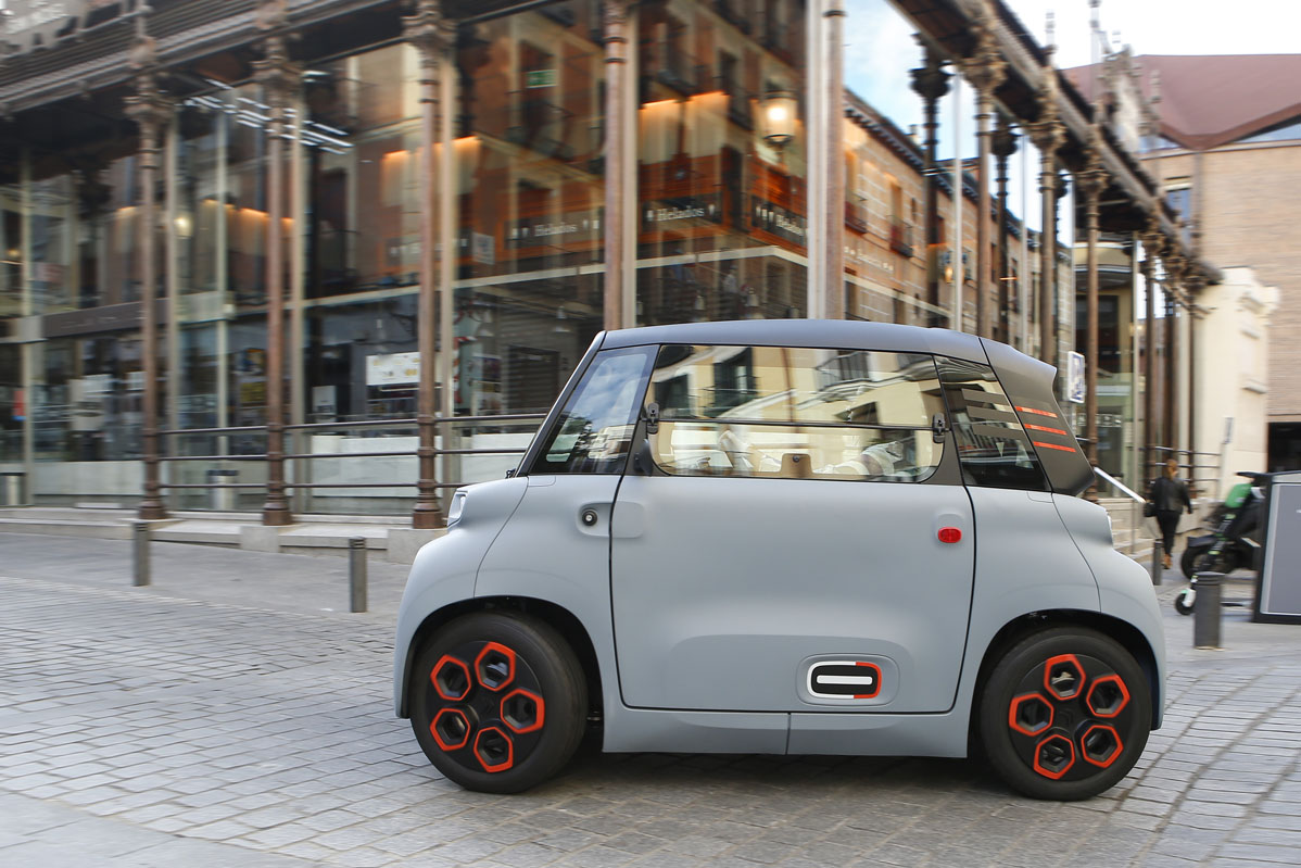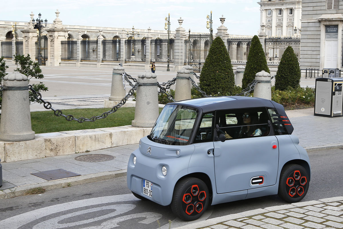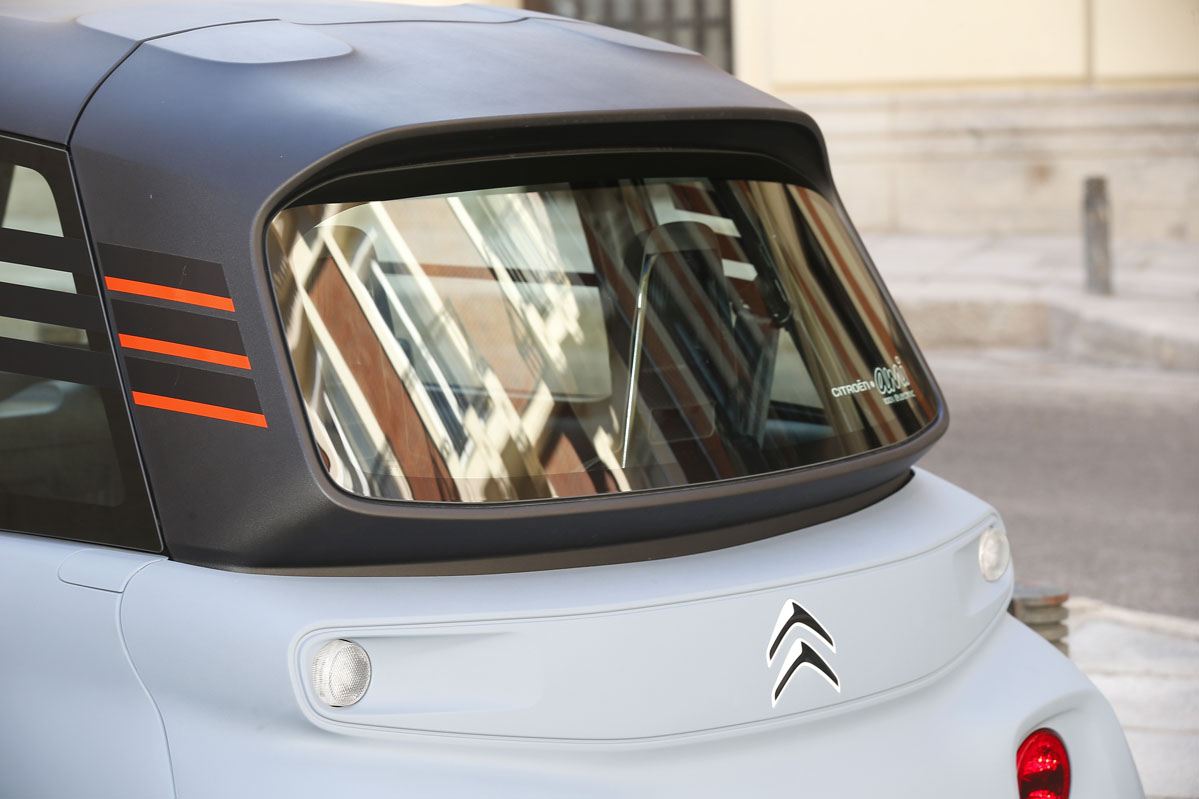 Su diseño, inspirado en el Citroën Ami One Concept y de esos que no sabes si va o viene, parece sacado de una película futurista. Pero su desahogado espacio interior, a pesar de sus contenidísimas cotas, no es ciencia ficción, es real. Tiene una longitud de 2,41 m, menos que la batalla de un SEAT Ibiza -2,56 m-, una anchura de 1,39 m y una altura de 1,52 m. Por este motivo, porque carece casi de voladizos -las cuatro ruedas están colocadas en los extremos- y por su diámetro de giro de 7,20 m -el de un Twingo es de 8,60 m- es un vehículo perfecto para circular por la ciudad. De carretera no hablamos porque por autopista la legislación no se lo permite, y por carretera convencional, no es el vehículo más recomendable al tener una velocidad máxima de 45 km/h.