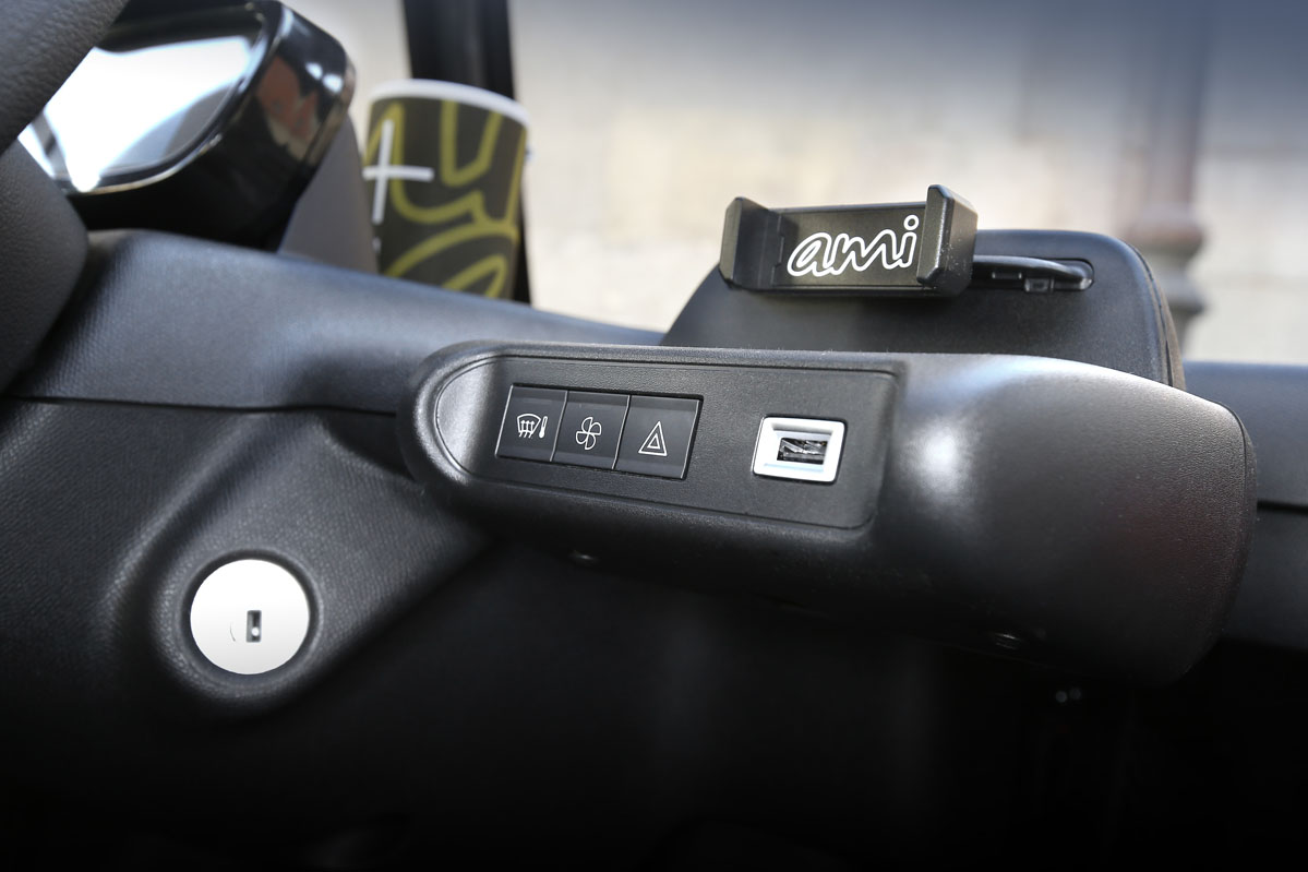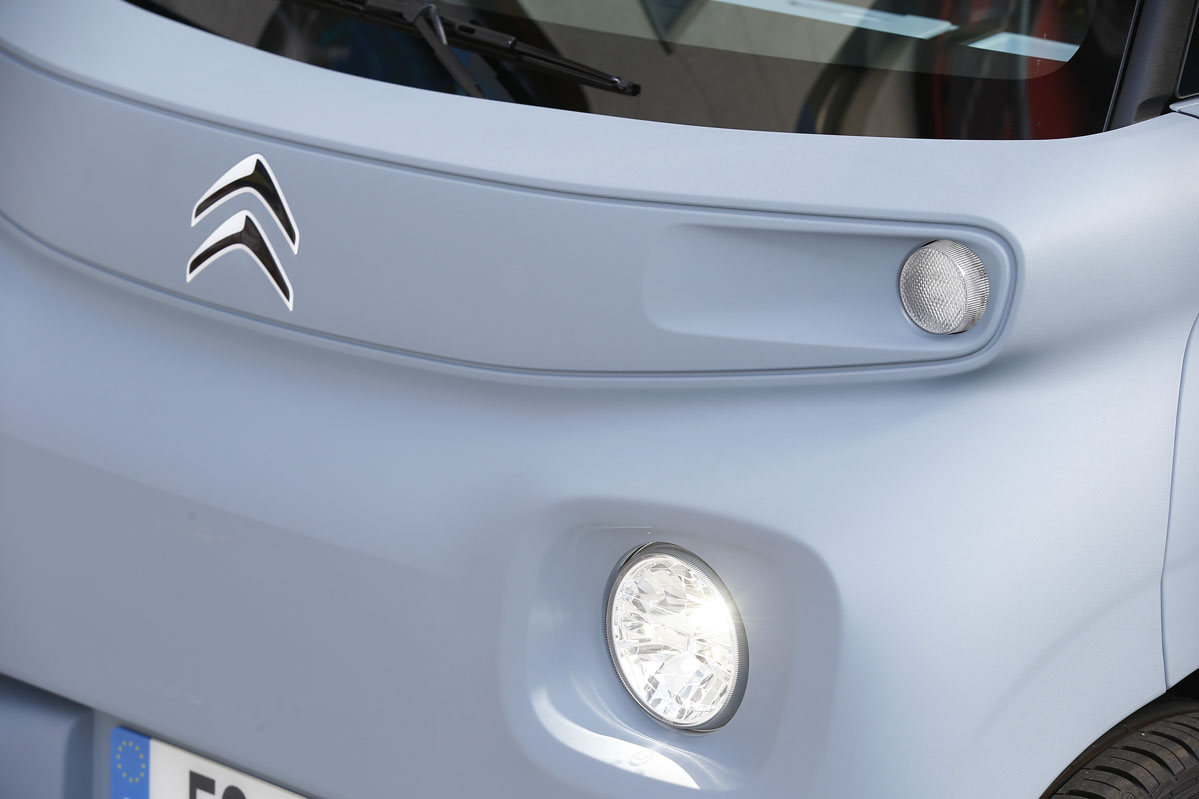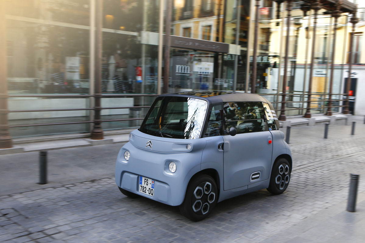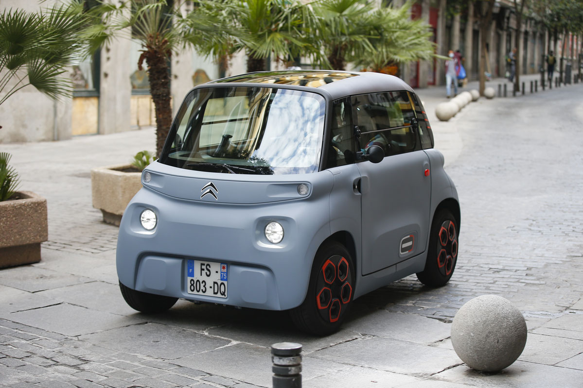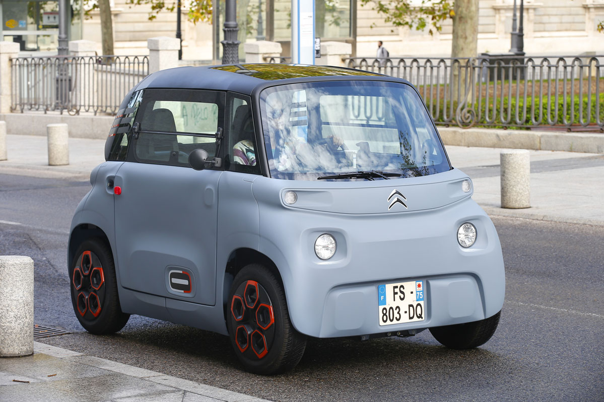 Su diseño, inspirado en el Citroën Ami One Concept y de esos que no sabes si va o viene, parece sacado de una película futurista. Pero su desahogado espacio interior, a pesar de sus contenidísimas cotas, no es ciencia ficción, es real. Tiene una longitud de 2,41 m, menos que la batalla de un SEAT Ibiza -2,56 m-, una anchura de 1,39 m y una altura de 1,52 m. Por este motivo, porque carece casi de voladizos -las cuatro ruedas están colocadas en los extremos- y por su diámetro de giro de 7,20 m -el de un Twingo es de 8,60 m- es un vehículo perfecto para circular por la ciudad. De carretera no hablamos porque por autopista la legislación no se lo permite, y por carretera convencional, no es el vehículo más recomendable al tener una velocidad máxima de 45 km/h.