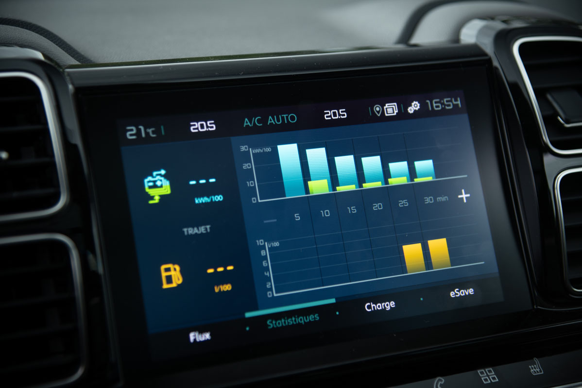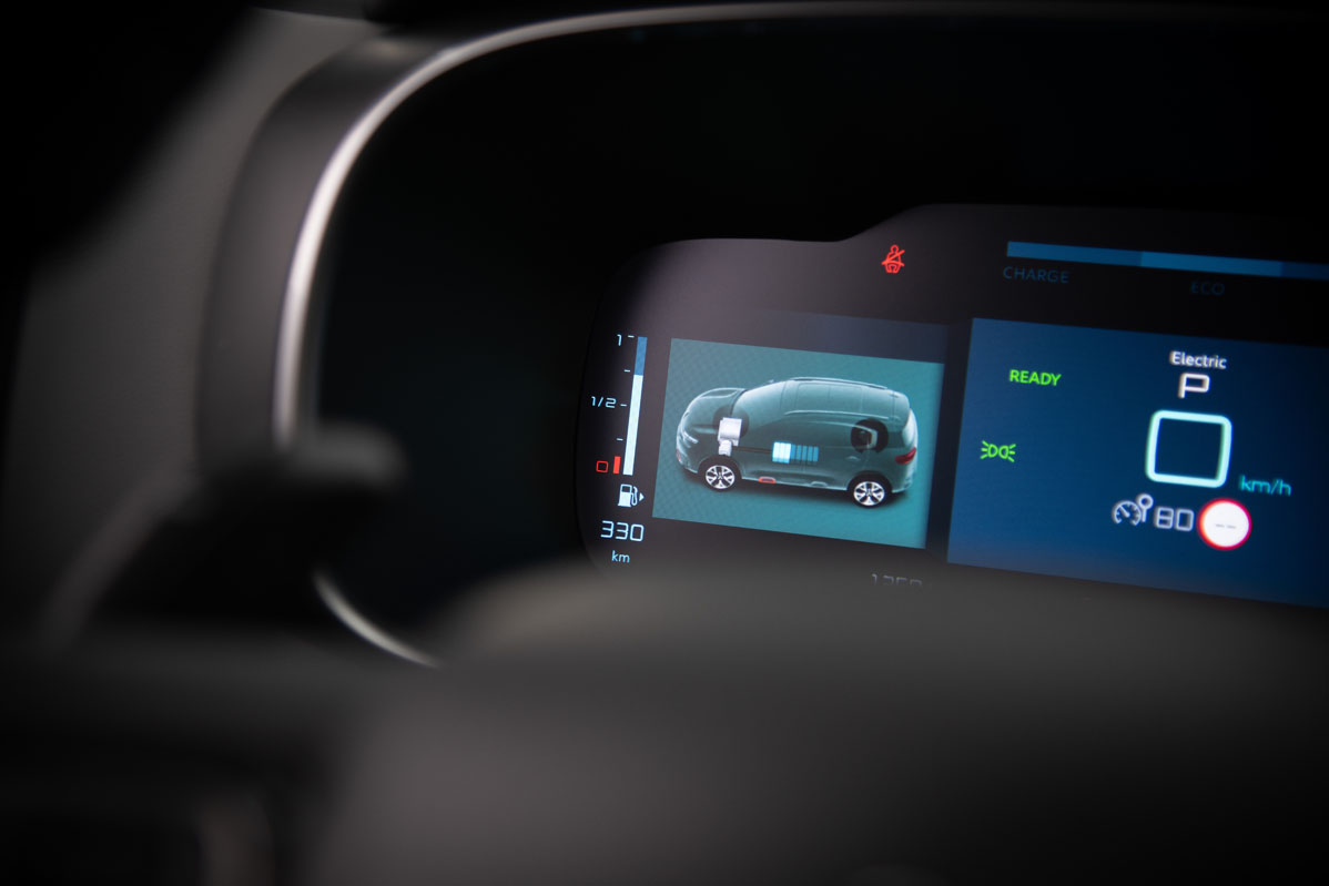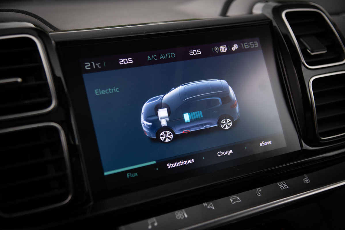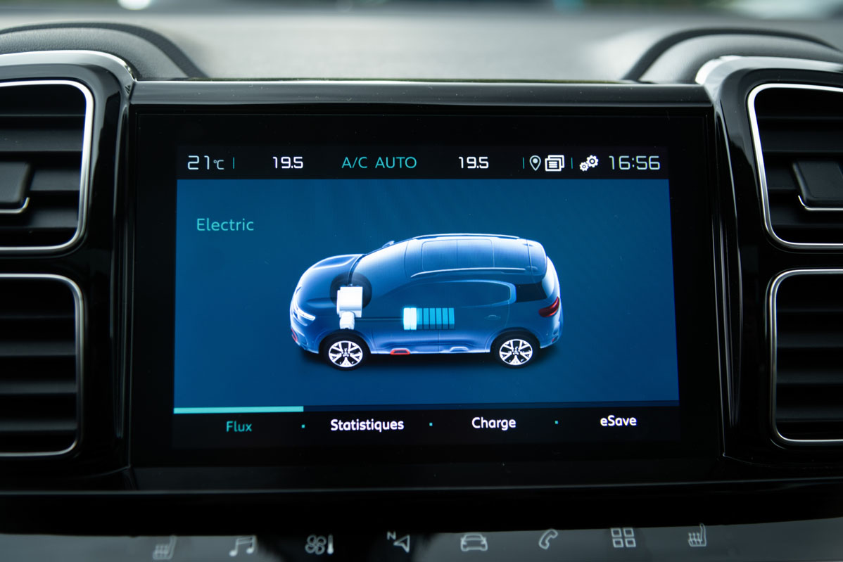 Las modificaciones en el interior del Citroën C5 Aircross Hybrid también son sutiles: la consola integra un nuevo botón para controlar desde la pantalla las funciones del sistema eléctrico -también tiene gráficos exclusivos con el flujo de energía-, la parte inferior del retrovisor tiene un luz que se enciende cuando se circula en modo 100% eléctrico y que es visible desde el exterior, por si al agente de turno del centro de tu ciudad tiene alguna duda de que conduces un coche eléctrico, y el cuadro de instrumentos digital, en su parte superior, indica el gasto y la carga de electricidad.