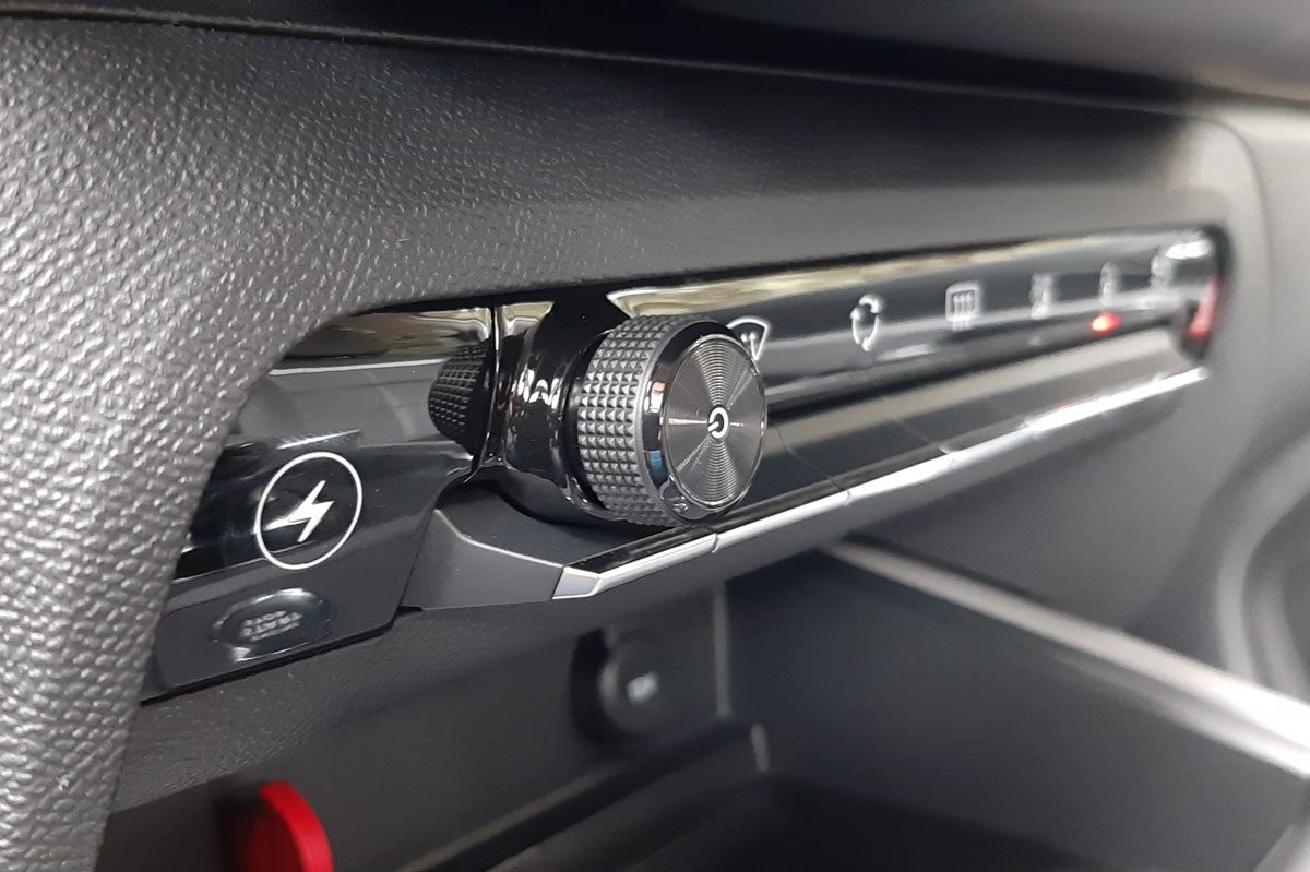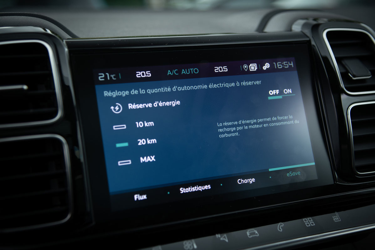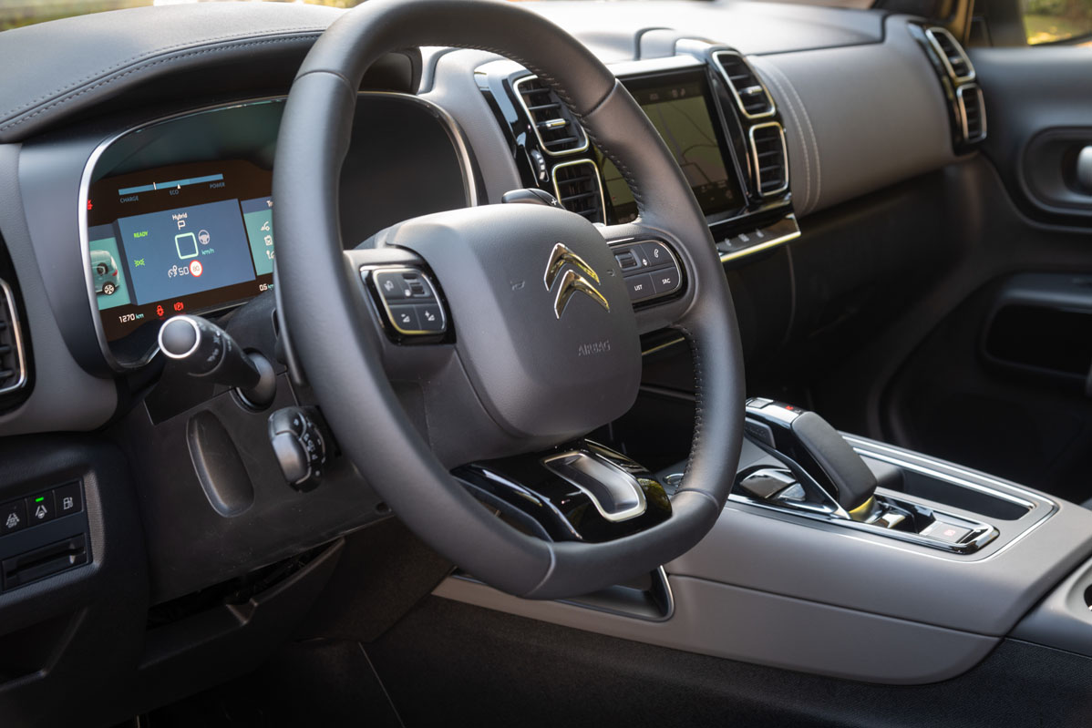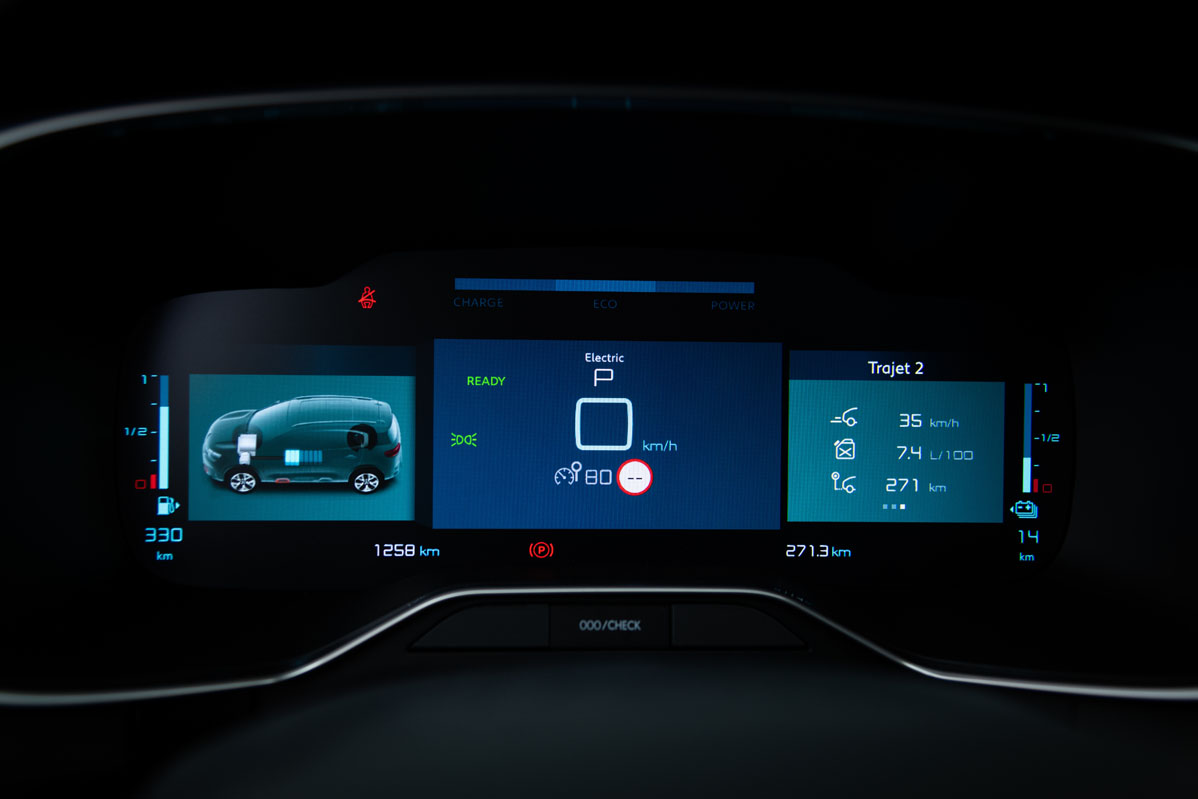Las modificaciones en el interior del Citroën C5 Aircross Hybrid también son sutiles: la consola integra un nuevo botón para controlar desde la pantalla las funciones del sistema eléctrico -también tiene gráficos exclusivos con el flujo de energía-, la parte inferior del retrovisor tiene un luz que se enciende cuando se circula en modo 100% eléctrico y que es visible desde el exterior, por si al agente de turno del centro de tu ciudad tiene alguna duda de que conduces un coche eléctrico, y el cuadro de instrumentos digital, en su parte superior, indica el gasto y la carga de electricidad.