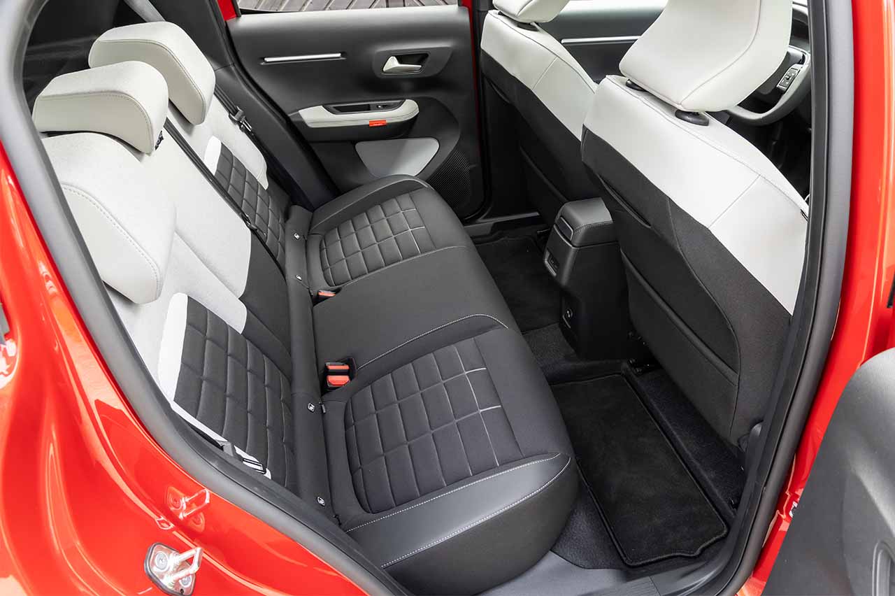 En el interior sea quizá en donde más influenciado se vea este ë-C3 con respecto al C3 de combustión. Las plazas traseras están mermadas en términos de amplitud, sobre todo para las piernas, al tener que dar cabida a la batería bajo el piso de los asientos traseros. Al menos ello implica que el maletero es exactamente igual, con 310 litros de capacidad, un dato excelente para un utilitario eléctrico.