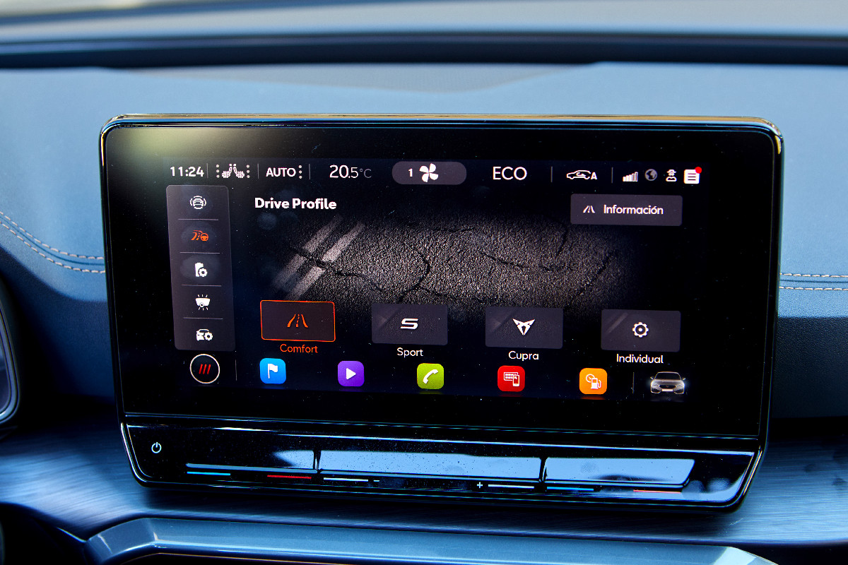 Este cuenta con un botón Cupra para llevarnos directamente los modos más deportivos y una parte central con un magnífico símil en fibra de carbono que me recuerda al que emplea BMW en algunos de sus salpicaderos.