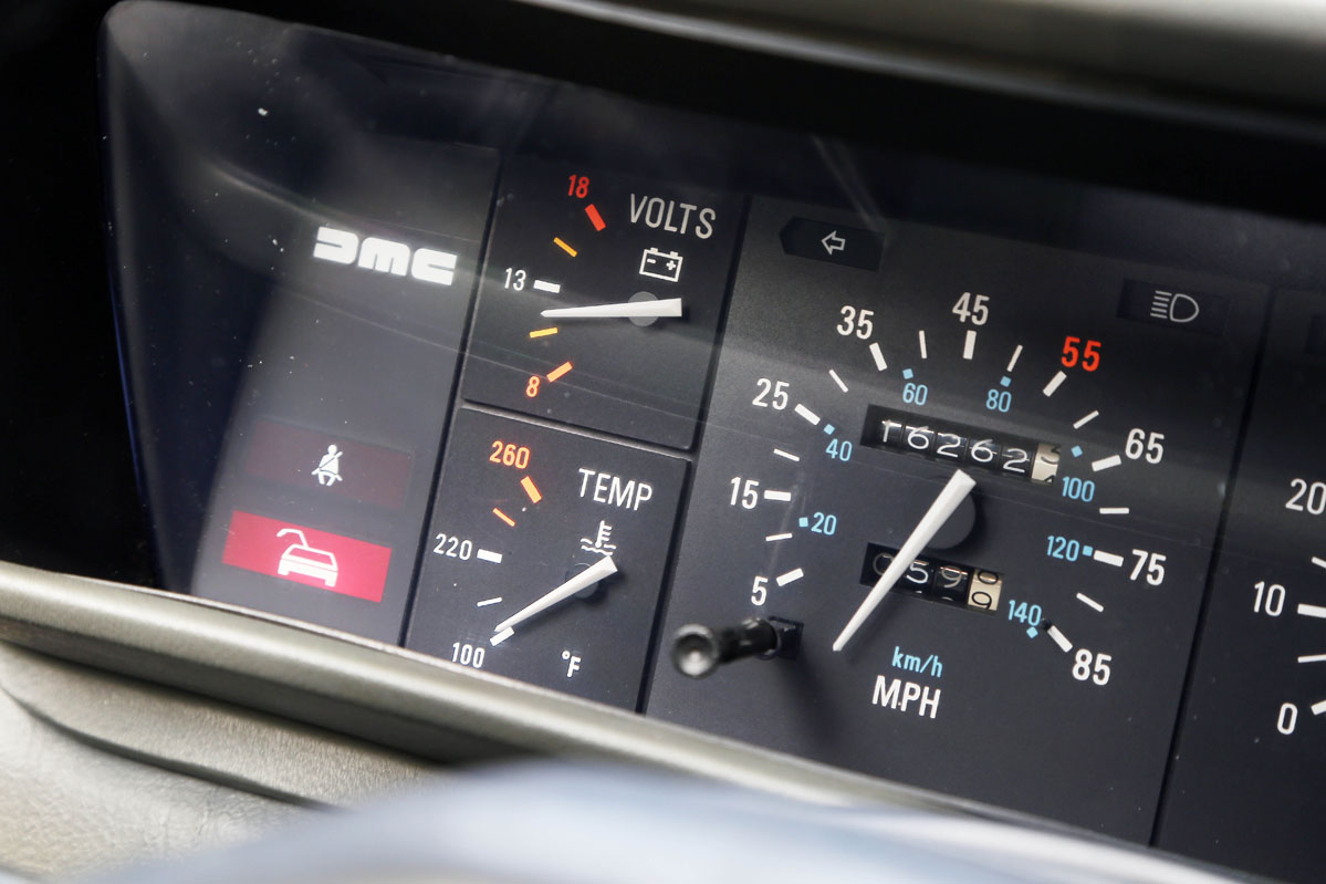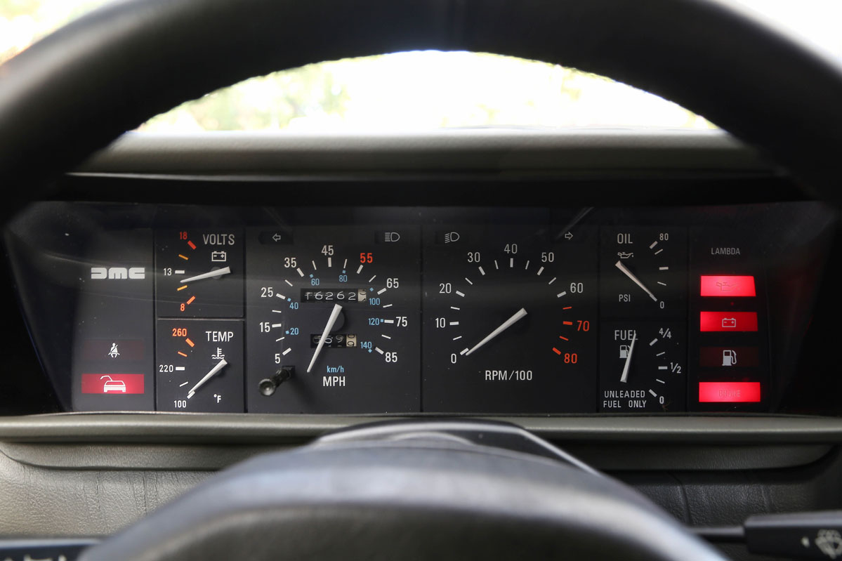Por cierto, que engaña en esto de la velocidad. Durante años -y pido disculpas si lo he llegado a publicar en algún momento-, me molestaba un poco que el coche teóricamente no pasara de las 85 millas -algo menos de las famosas 88 mph (140 km/h)- con las que en la película se viajaba en el tiempo. Pero hoy ha sido una alegría comprobar que claro que lo hacía, hasta los 180 km/h. Lo que pasaba es que el marcador engañaba deliberadamente, ya que la legislación estadounidense del momento, para no incentivar los excesos de velocidad y consumo en aquella segunda crisis energética, obligaba a que todos los coches llevaran aquellas limitaciones visuales. Y es por ello que muchos propietarios hoy ponen otros tacómetros calibrados para medir la velocidad real.