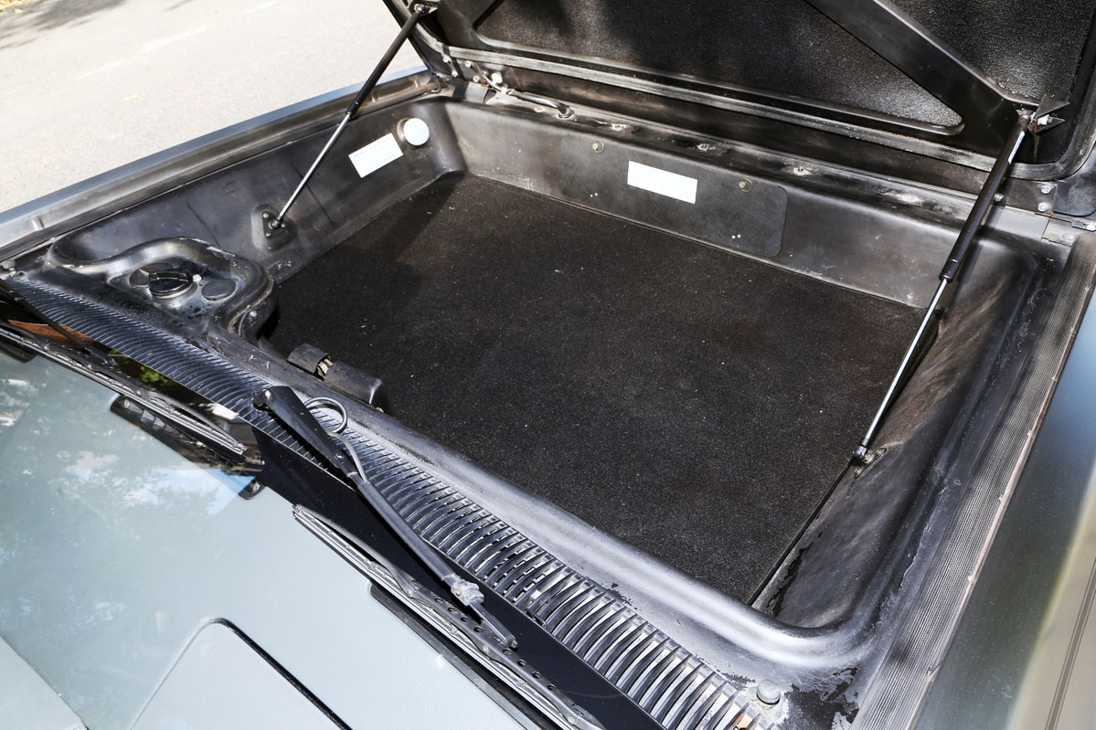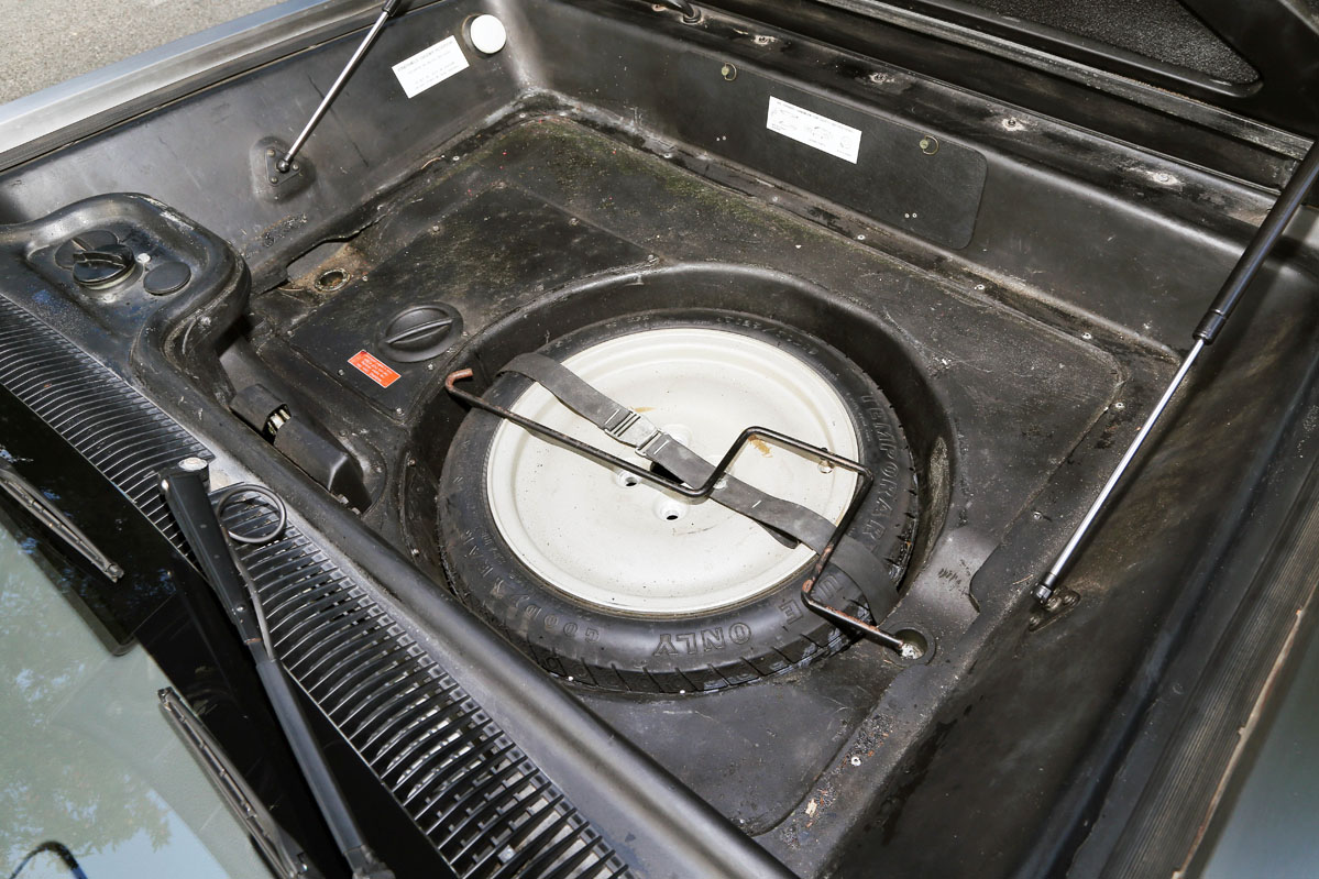 Con todo esto, me creo lo que su propietario me cuenta acerca de que es un clásico relativamente cómodo y utilizable. Y, añado yo, hasta por carreteras viradas de montaña con suelo mojado: si no lo lastras aún más con objetos en el maletero (delante, bajo el capó, donde también va la rueda de repuesto) y lo llevas un poco alegre de vueltas (con este automático es más complicado) pues hasta disfrutarás de una conducción que inspira confianza aunque no es el colmo de las sensaciones racing ni por sonido ni por agilidad real. Lo malo es al maniobrar, que se llega a hacer antipático: sus formas tan angulosas no permiten calcular muy bien los límites por delante; y por detrás, todo son reducciones del campo visual por el retrovisor del centro, la cubierta tipo cortina...