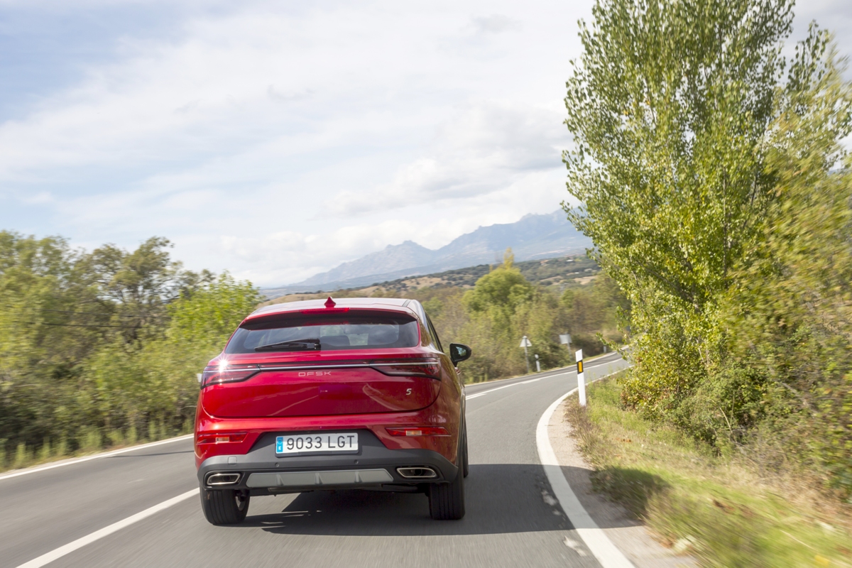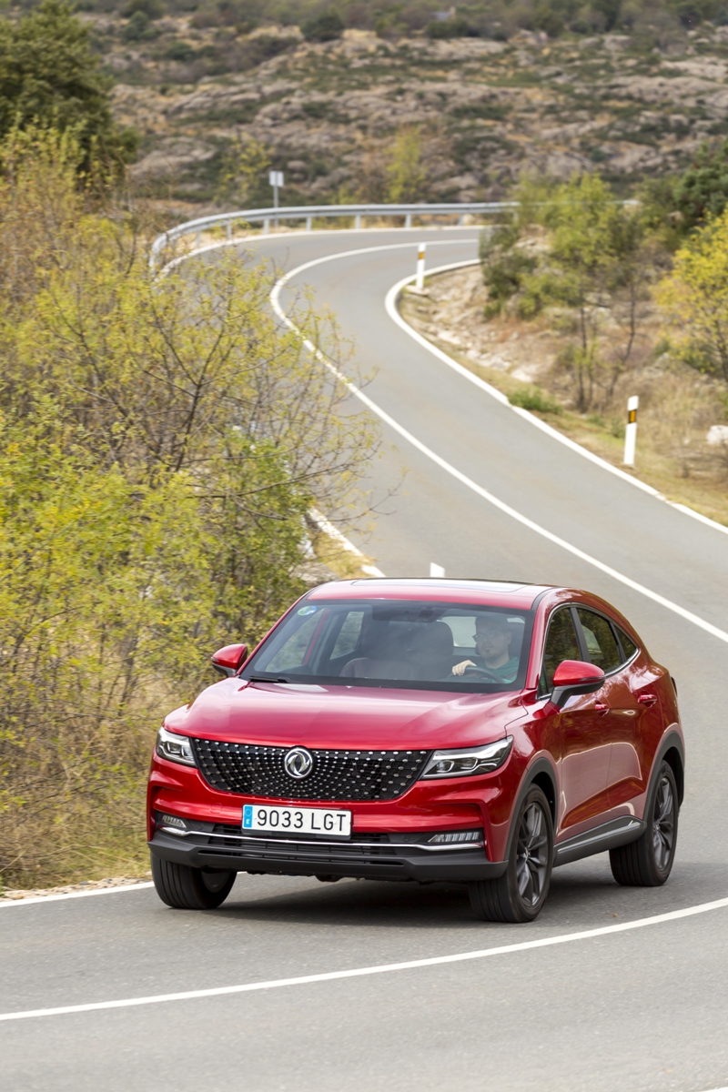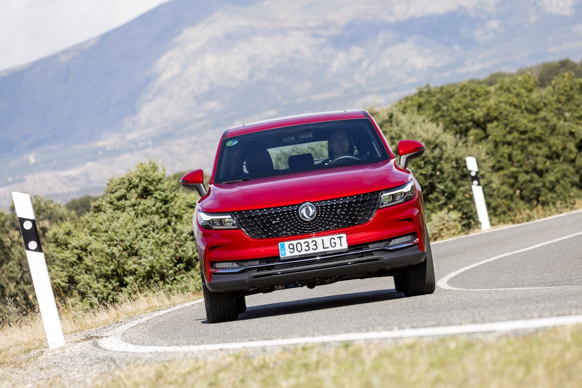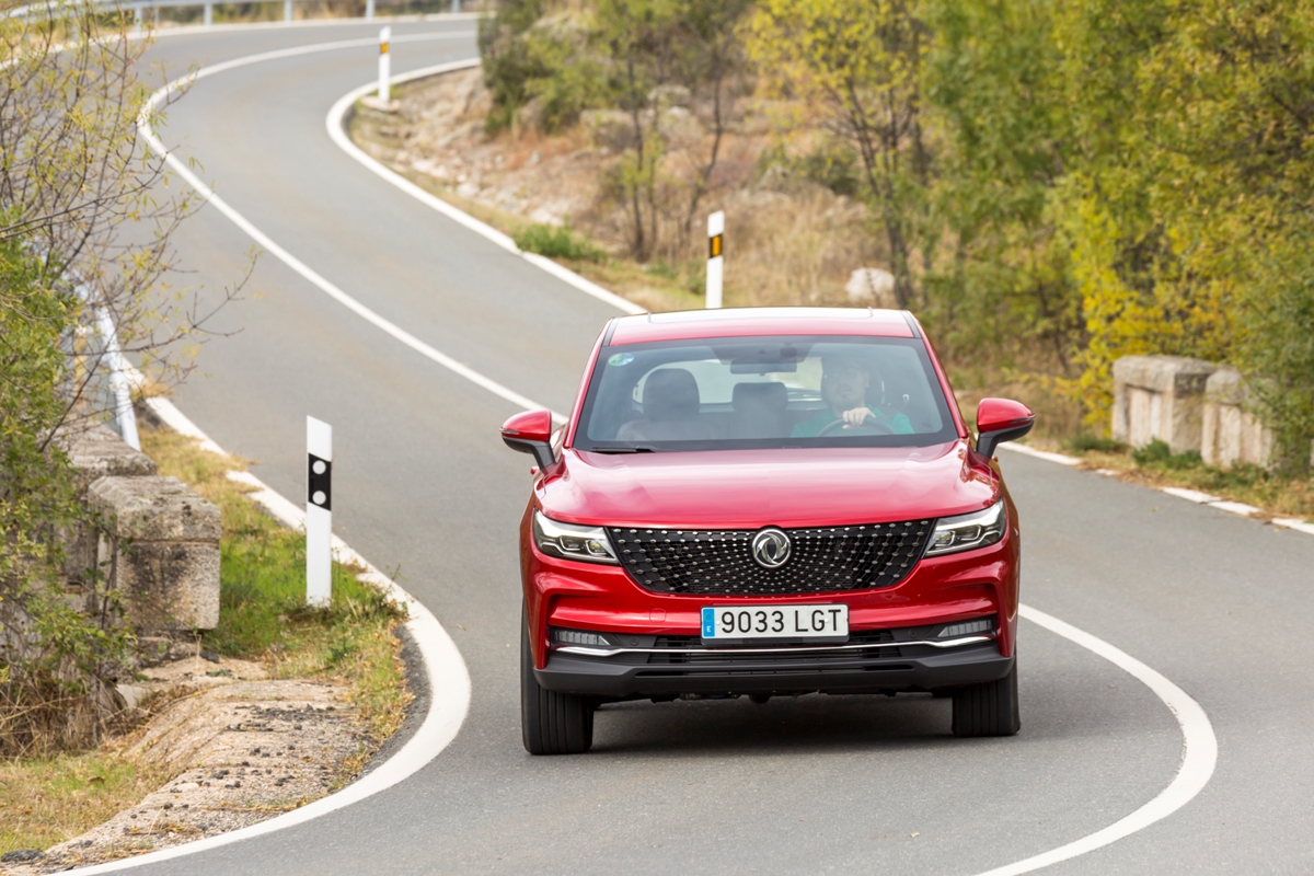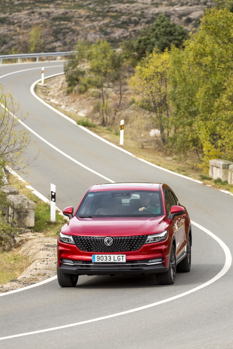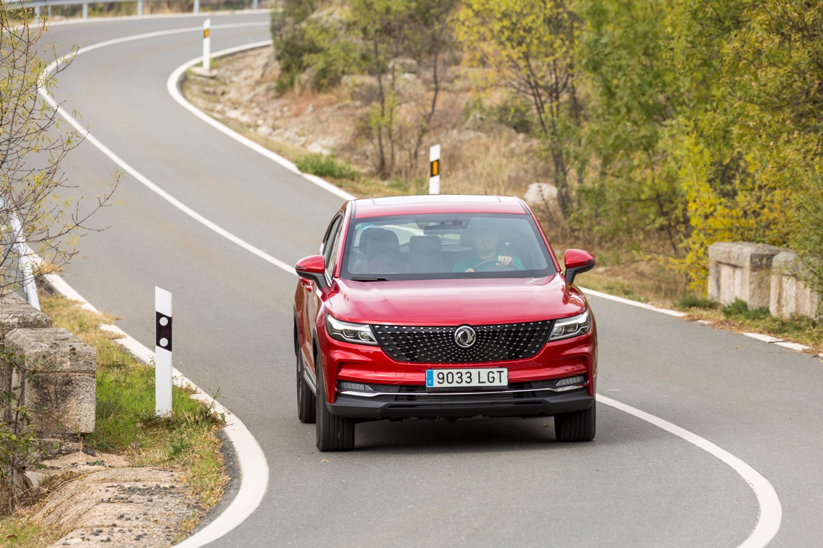 En materia de chasis, el tacto es correcto. La dirección, aunque poco informativa, ofrece un tacto agradable y mantiene bien la trayectoria. Nada que ver, sin ir más lejos, con las de algunos coreanos de hace una o dos generaciones, que eran malas y obligaban a hacer correcciones constantes en el volante. En este sentido, en DFSK apuntan en la buena dirección, como también lo han hecho con una puesta a punto de chasis que hace que el coche sea cómodo, aunque no especialmente ágil. Esto último no termina de casar con la imagen de deportividad que transmite el diseño exterior, pero tampoco supondrá ningún problema para quien busque un coche para hacer desplazamientos confortables, sin más. A los mandos, el conductor tiene sensaciones a mitad de camino entre un SUV y un todoterreno, especialmente a la hora de afrontar curvas, con un balanceo de carrocería más acusado de lo habitual. Desde luego, no es un coche pensado para correr, ni por la configuración de la suspensión ni por el conjunto motor/cambio. Esto conviene tenerlo en cuenta para no llevarse sorpresas.