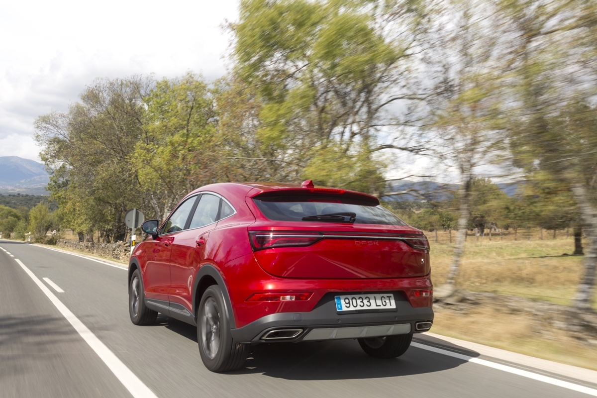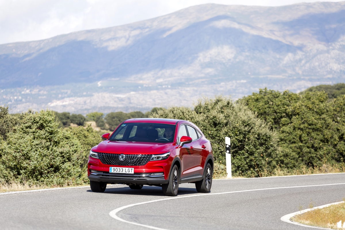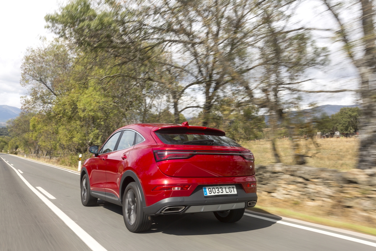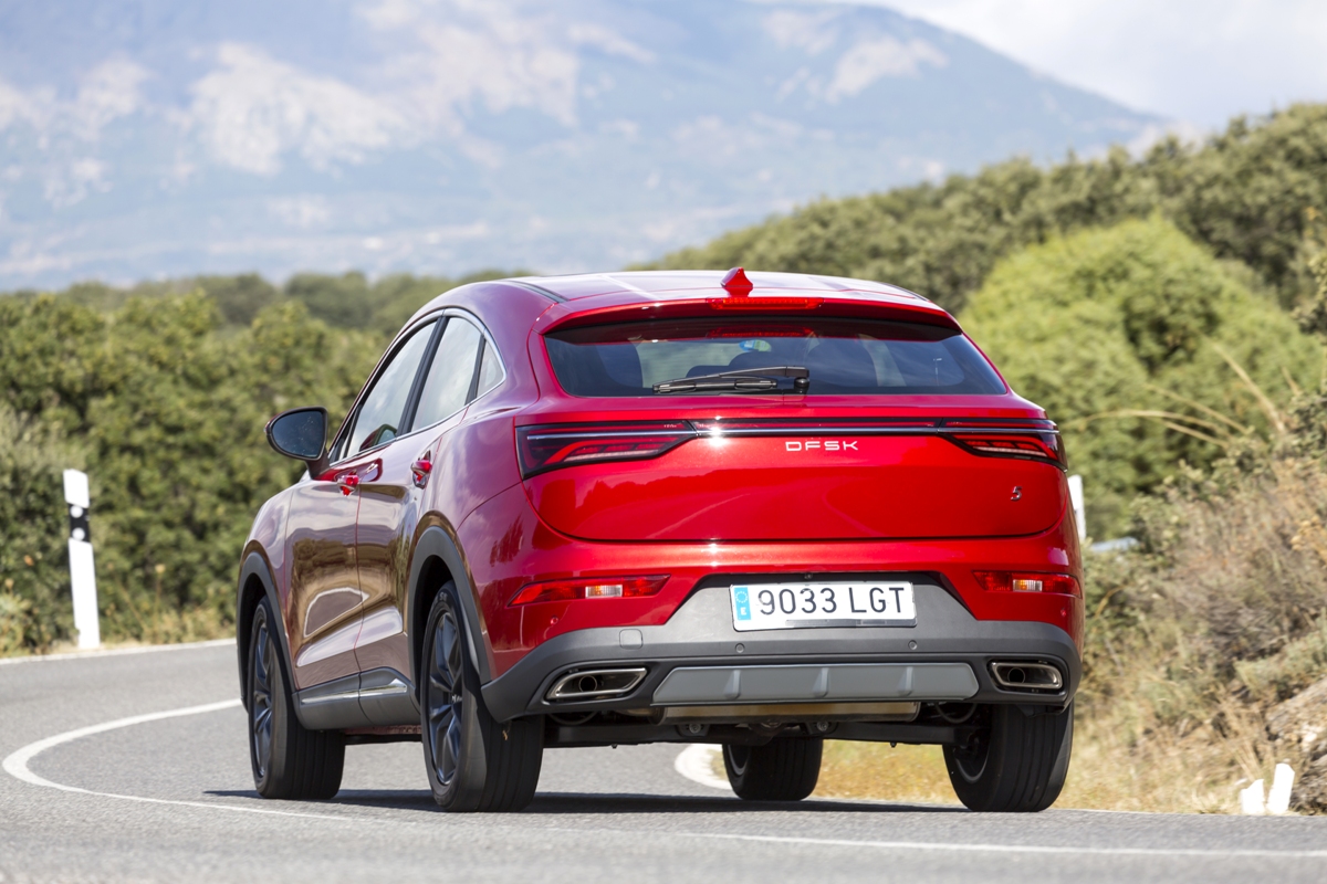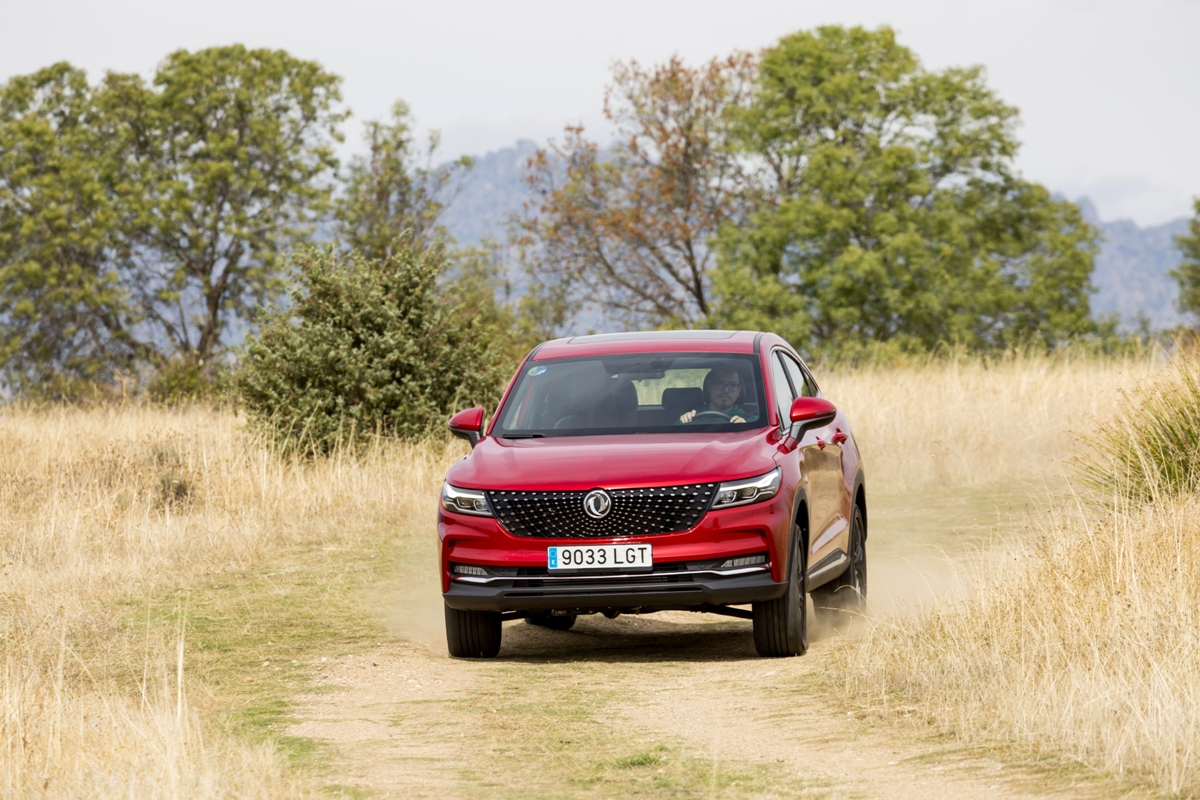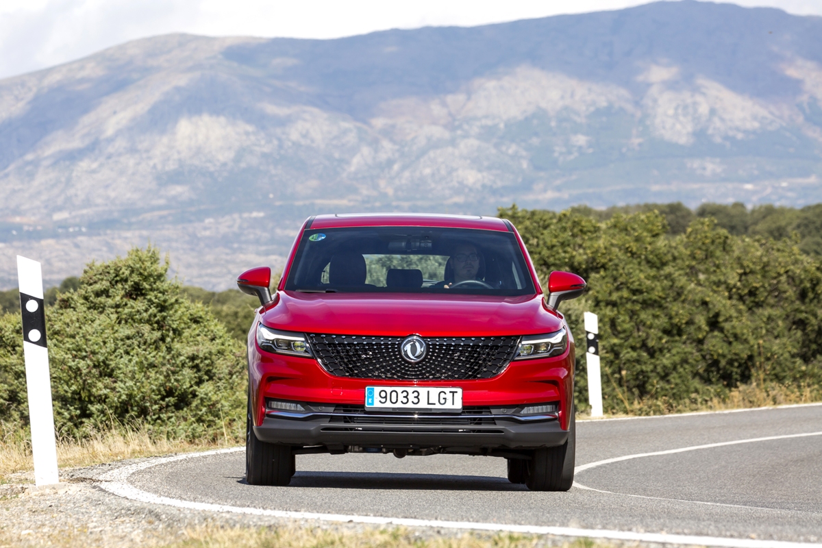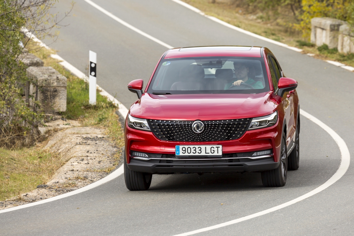 En materia de chasis, el tacto es correcto. La dirección, aunque poco informativa, ofrece un tacto agradable y mantiene bien la trayectoria. Nada que ver, sin ir más lejos, con las de algunos coreanos de hace una o dos generaciones, que eran malas y obligaban a hacer correcciones constantes en el volante. En este sentido, en DFSK apuntan en la buena dirección, como también lo han hecho con una puesta a punto de chasis que hace que el coche sea cómodo, aunque no especialmente ágil. Esto último no termina de casar con la imagen de deportividad que transmite el diseño exterior, pero tampoco supondrá ningún problema para quien busque un coche para hacer desplazamientos confortables, sin más. A los mandos, el conductor tiene sensaciones a mitad de camino entre un SUV y un todoterreno, especialmente a la hora de afrontar curvas, con un balanceo de carrocería más acusado de lo habitual. Desde luego, no es un coche pensado para correr, ni por la configuración de la suspensión ni por el conjunto motor/cambio. Esto conviene tenerlo en cuenta para no llevarse sorpresas.