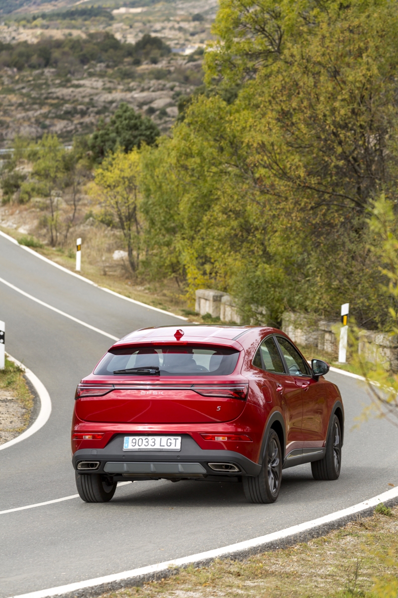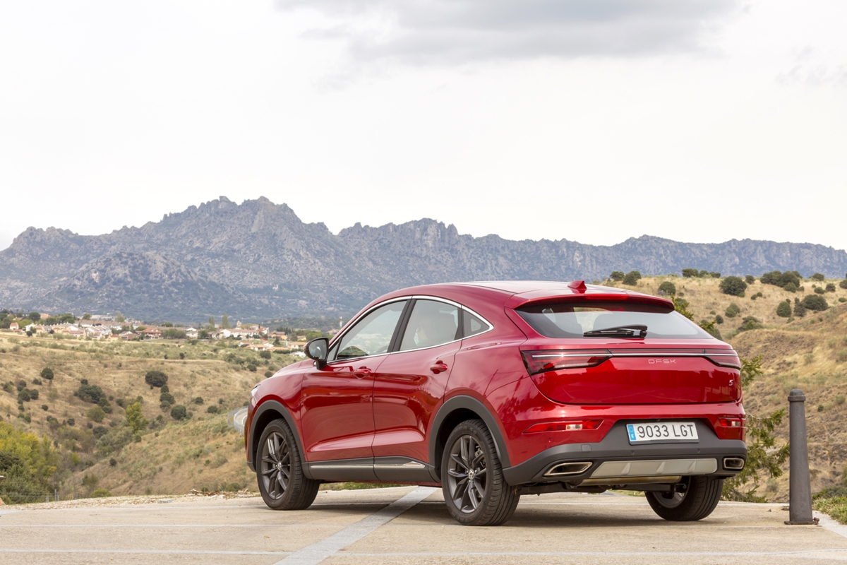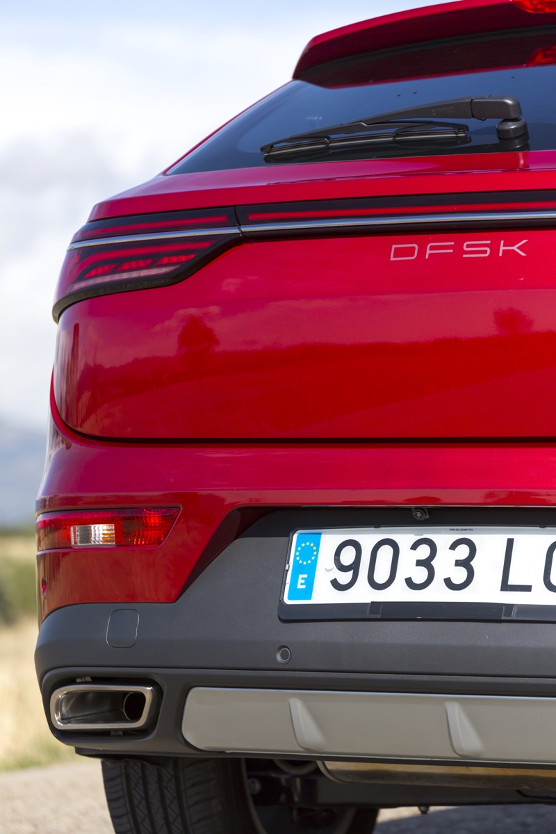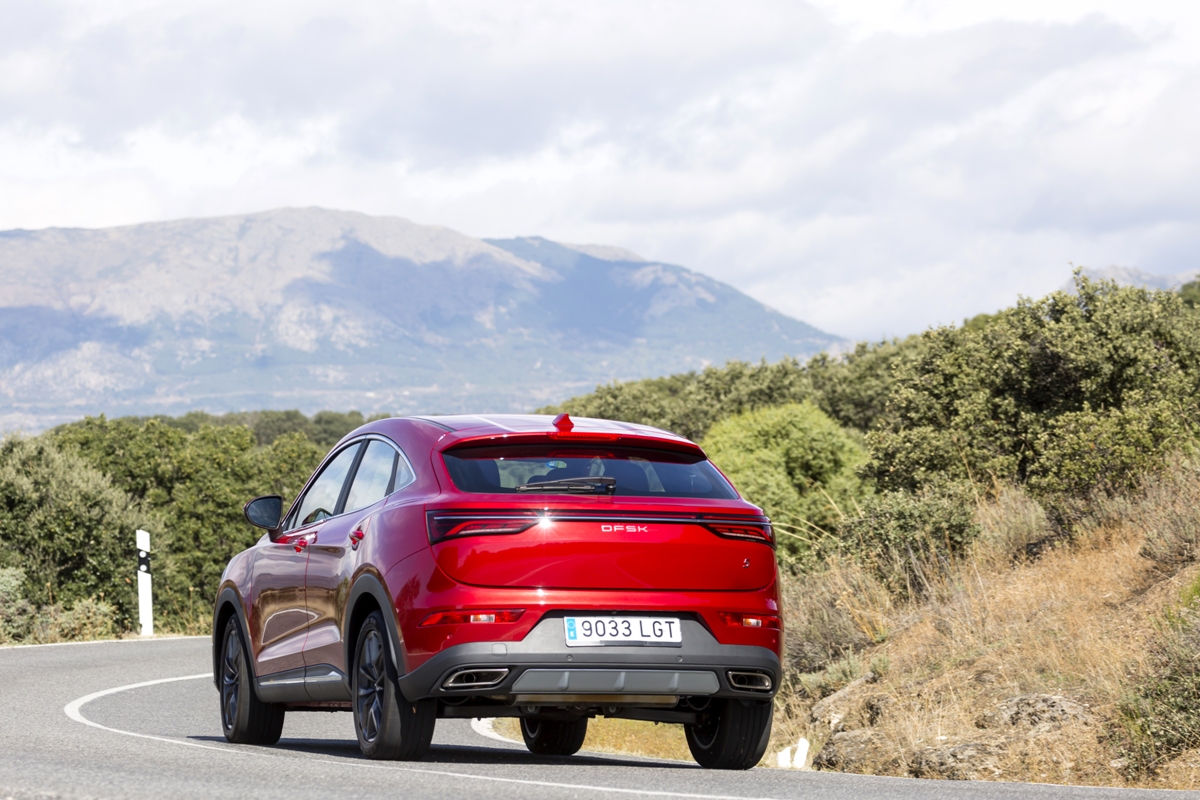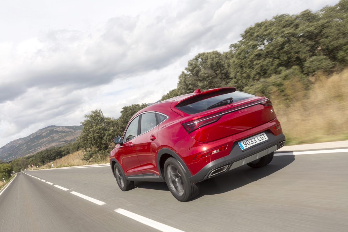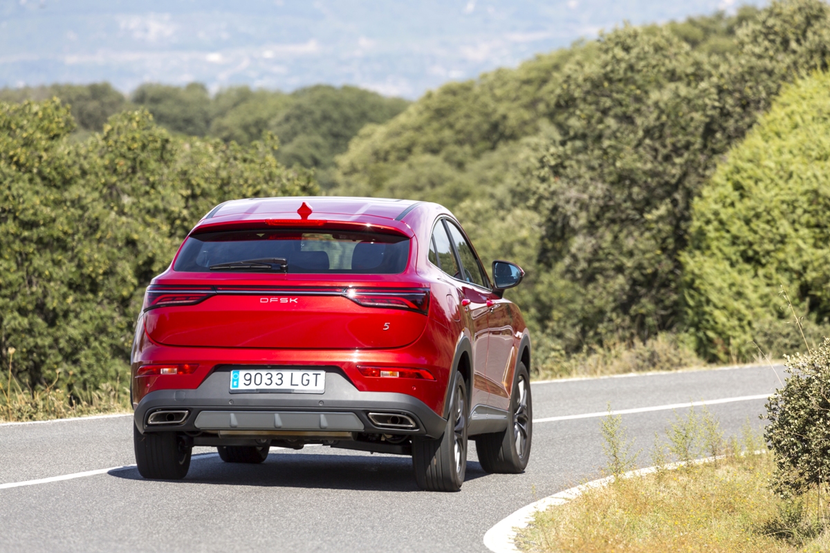 En materia de chasis, el tacto es correcto. La dirección, aunque poco informativa, ofrece un tacto agradable y mantiene bien la trayectoria. Nada que ver, sin ir más lejos, con las de algunos coreanos de hace una o dos generaciones, que eran malas y obligaban a hacer correcciones constantes en el volante. En este sentido, en DFSK apuntan en la buena dirección, como también lo han hecho con una puesta a punto de chasis que hace que el coche sea cómodo, aunque no especialmente ágil. Esto último no termina de casar con la imagen de deportividad que transmite el diseño exterior, pero tampoco supondrá ningún problema para quien busque un coche para hacer desplazamientos confortables, sin más. A los mandos, el conductor tiene sensaciones a mitad de camino entre un SUV y un todoterreno, especialmente a la hora de afrontar curvas, con un balanceo de carrocería más acusado de lo habitual. Desde luego, no es un coche pensado para correr, ni por la configuración de la suspensión ni por el conjunto motor/cambio. Esto conviene tenerlo en cuenta para no llevarse sorpresas.