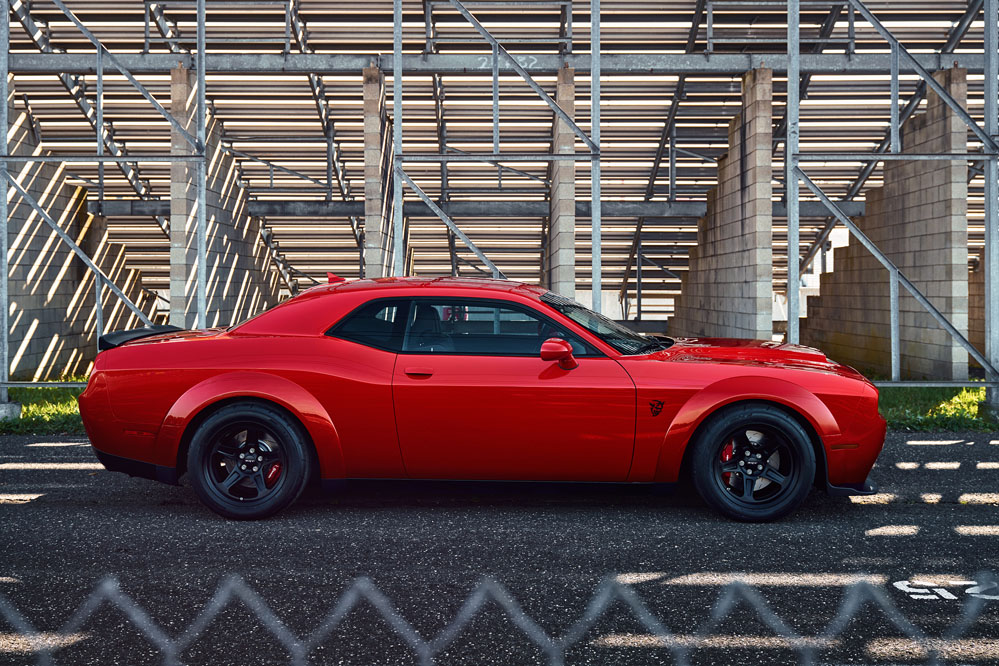 Pero antes de comenzar a disfrutar hecho un vistazo a su exterior para apreciar los cambios respecto al (prueba) Dodge Challenger Hellcat. Uno de ellos los tiene su perfil: los pasos de rueda. Son mas robustos, sobredimensionados, que además de darle una presencia imponente, sirven para alojar neumáticos más anchos. Como el coche de la prueba tiene la configuración especial para 'drag race', los neumáticos delanteros, que pueden llegar a levantarse del suelo unos 90 centímetros, son muy estrechos.