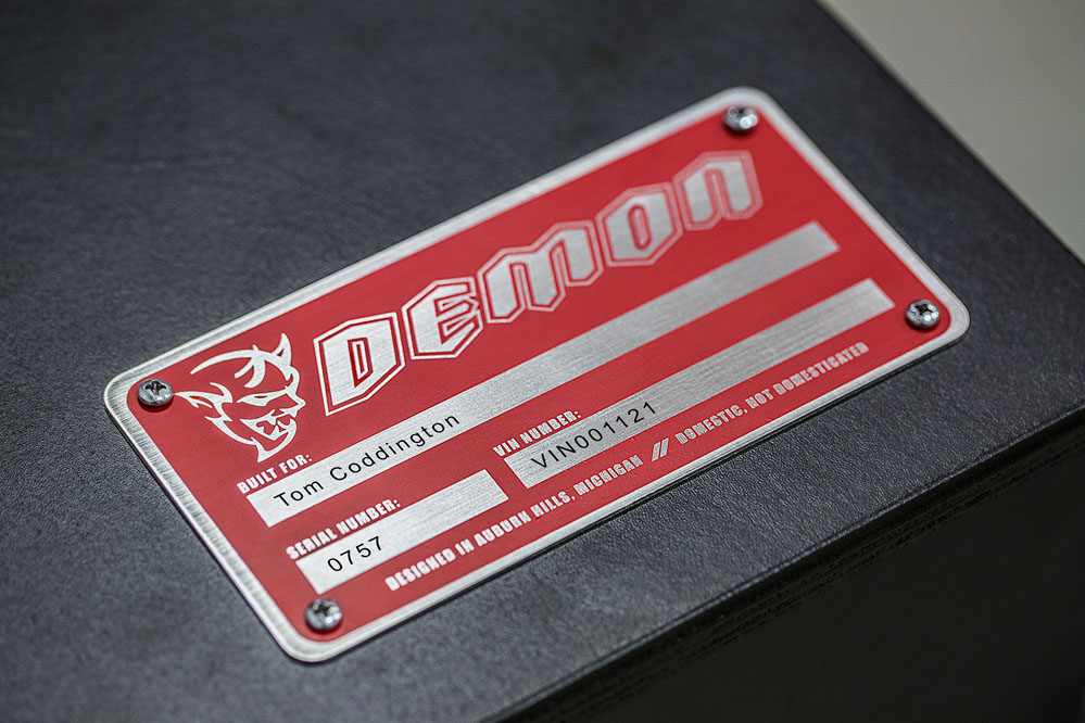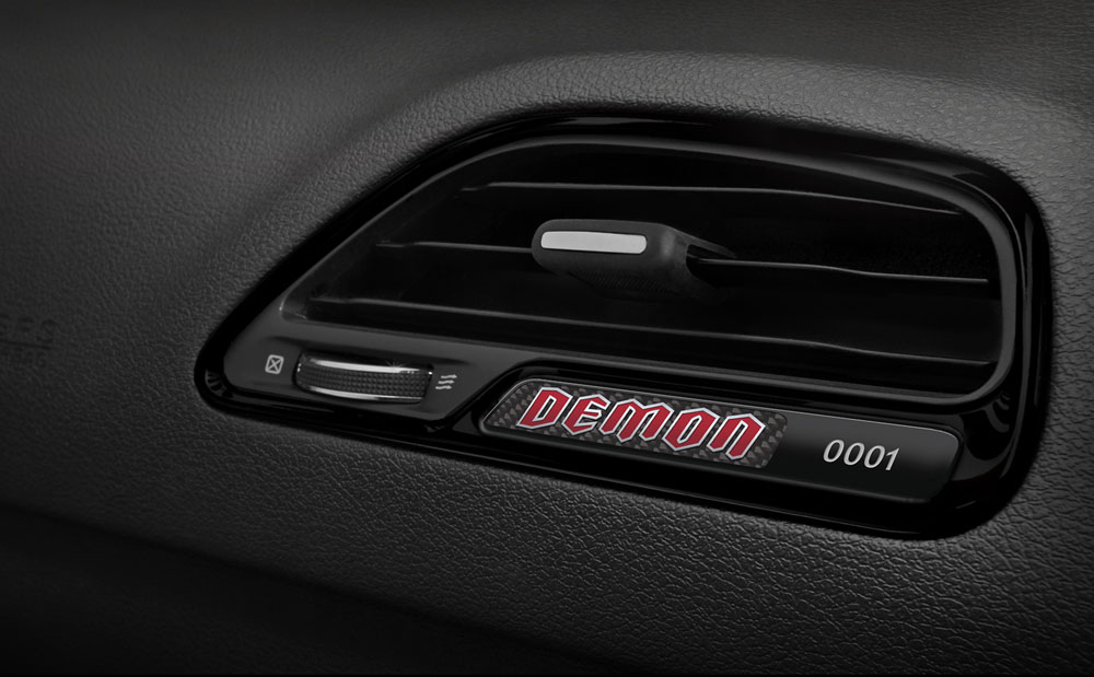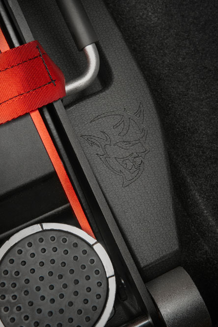 Una vez pasado revista al exterior, toca el interior, que no cambia mucho respecto al Hellcat. El volante es el mismo, pero ahora viene tapizado en Alcantara. Los cinturones, que están personalizados con el logo del Demon, son de cinco puntos de anclaje, por lo que es una tarea más engorrosa ponérselos si lo comparo con uno de tres, pero ten en cuenta que son obligatorios si vas a competir. Los asientos también son los mismos, los firmados por SRT, solo que en el respaldo está impreso el demonio; son cómodos porque son mullidos, pero al mismo tiempo tienen mucho apoyo lateral. Además, las tomas de refrigeración esconden un easter egg; la palabra ‘Demon’ en ellas. Pero no es el único huevo de pascua, puesto que tanto el parabrisas como la luna trasera llevan impreso en pequeño un coche quemando rueda.