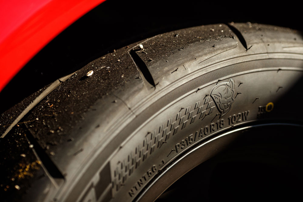 No así los traseros, que tienen unas medias de 315/40 18. Éstos, que van montados en unas llantas forjadas, han sido fabricados especialmente para el coche, como muestra el logo del domino inscrito en ellos, para maximizar así la tracción en la pista. Tienen un compuesto especial extremadamente blando y menos rigidez lateral, por lo que la velocidad máxima está limitada a 263 km/h (164 mph) -puede alcanzar los 321 km/h (200 mph)-.