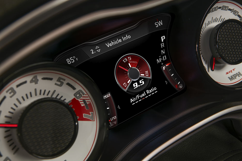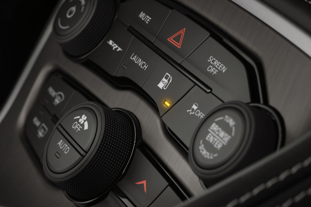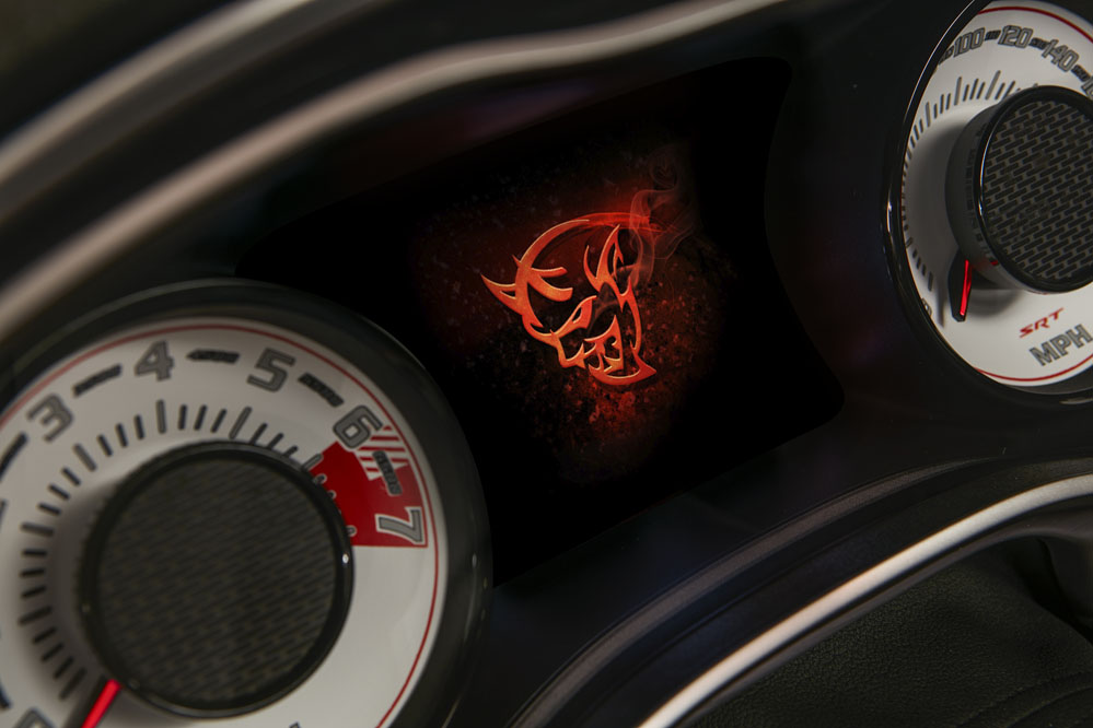 Es hora de encender el vehículo. Lo hago pulsando un botón. Aparece el logo del demonio en la pantalla del cuadro de instrumentos, un cuadro de instrumentos que es igual al del Hellcat, solo que las esferas son blancas. Ajusto el volante en altura y profundidad de forma eléctrica, al igual que los asientos; rápidamente encuentro una posición de conducción cómoda. Asimismo, y a pesar de la toma de refrigeración del capó, tengo buena visibilidad frontal.