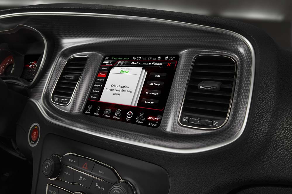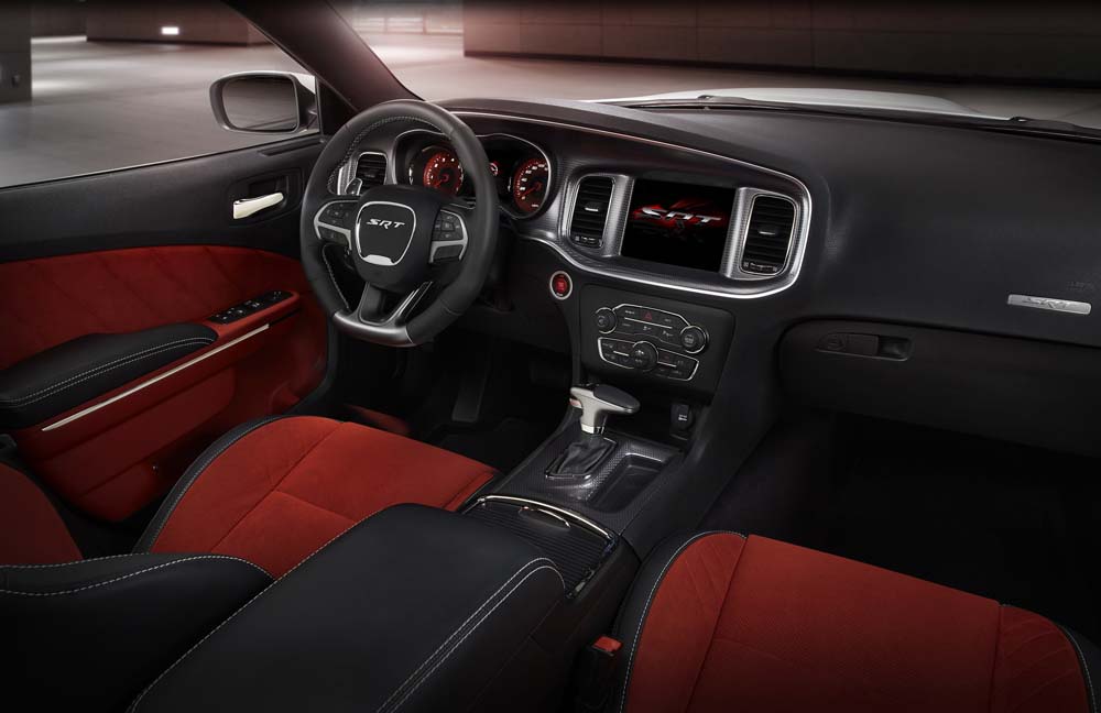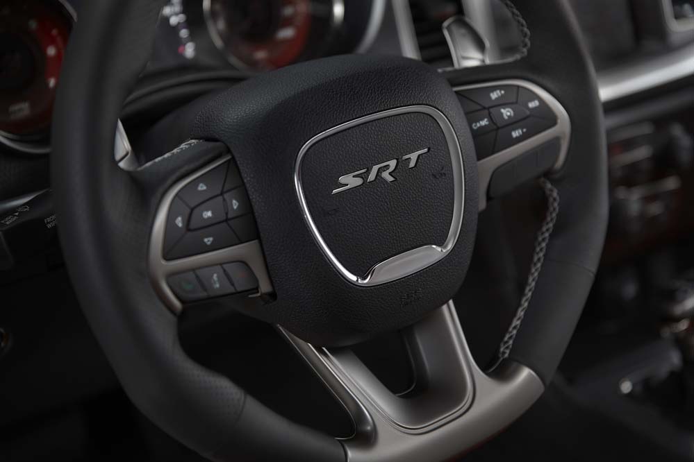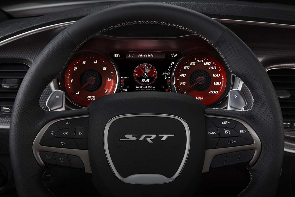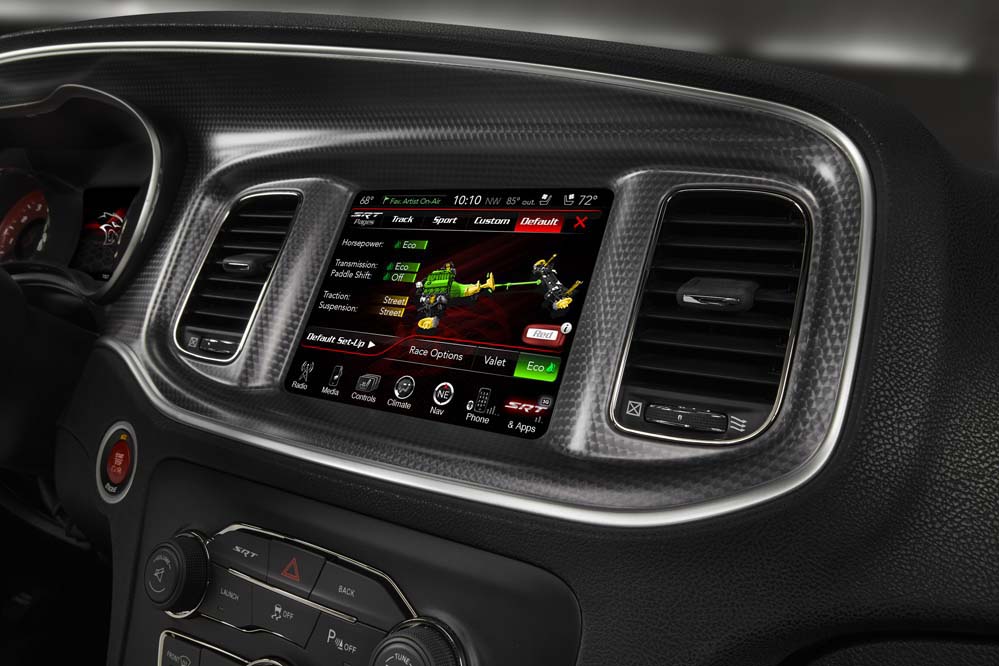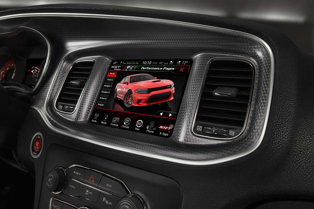 Como ocurre en el exterior, el habitáculo también incorpora elementos del otro Dodge SRT Hellcat de la gama, como el aluminio del salpicadero, el túnel de transmisión y el cuadro de instrumentos, que por cierto, adopta una pantalla digital de siete pulgadas. La del sistema de infoentretenimiento, situada en el salpicadero, es de cinco, aunque de forma opcional puede acoplarse una de ocho.
