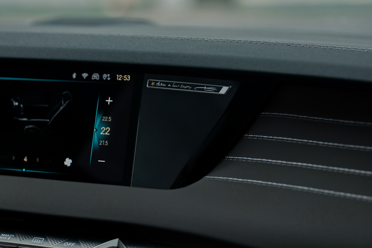 En el salpicadero, además de una placa con la firma de Antoine de Saint Exupéry, podemos encontrar unos bordados que evocan la estela que dejan los aviones al volar. En los umbrales de las puertas hay una placa que cuenta igualmente con la firma del aventurero y escritor y con una cita que dejó plasmada en la novela Correo del Sur: “las estrellas miden las verdaderas distancias”.