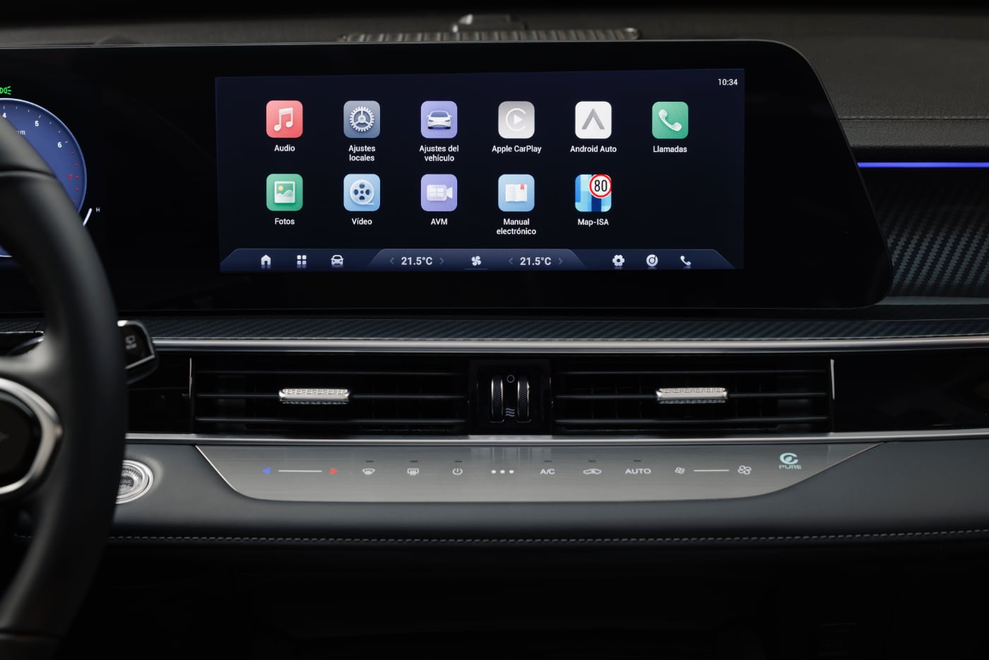 El volante está achatado por la parte inferior, adopta botones táctiles y está tapizado en cuero. De polipiel es la tapicería del acabado superior, el Luxury, y de tela el de acceso, el Comfort.